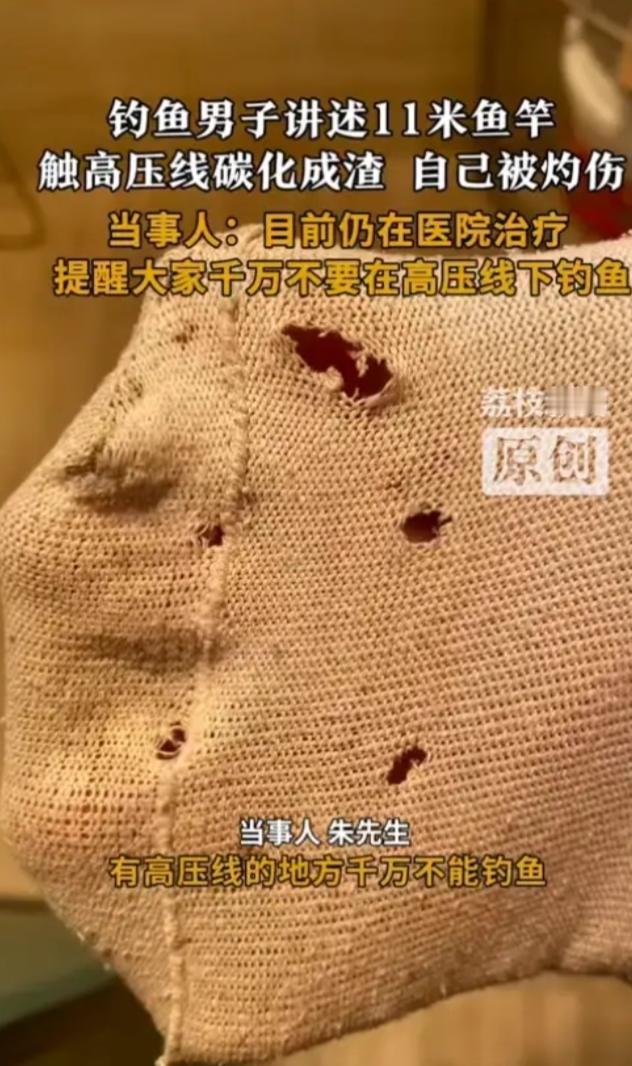 “太可怕了!”12月15日,安徽马鞍山,一男子钓鱼时,鱼竿碰到了上空的高压线,瞬间将男子电趴在地上,鱼竿也被电流碳化成渣,虽然戴着手套,但大拇指和食指依然被电焦,胳膊传来剧痛,连袜子都被电了几个窟窿。网友:太危险了! 事发当天天气不错,河边也很空旷,朱先生本来是兴致勃勃地出来钓鱼,想享受一下和大自然相处的时光,他做了自认为周全的准备,特意戴了绝缘手套,觉得这样就能防范触电风险,很多钓友也都有这种想法,觉得手套就是保命符。可谁能想到,在高压电面前,这些所谓的防护装备根本不堪一击。 就在他甩杆垂钓的瞬间,鱼竿的顶端意外碰到了上空的高压线,没有任何预兆,巨大的电流顺着竿身瞬间劈了下来,只听一声让人头皮发麻的炸裂声,手里的长鱼竿瞬间就变成了烧焦的炭渣,一碰就碎。 电流根本没被手套挡住,反而顺着受力的手指疯狂涌入,朱先生的大拇指和食指即便隔着手套,也当场被电焦,皮肤发黑发硬,疼得他瞬间失去了知觉。 那种痛楚真的难以想象,朱先生后来回忆,当时就感觉整条胳膊被扔进了滚烫的开水里,火烧火燎的剧痛顺着神经蔓延到全身,整个人根本来不及反应,就被电流的巨力击倒在地,动弹不得。 更吓人的是,电流在他身体里找出口时,直接击穿了脚上的袜子,留下了好几个黑黢黢的窟窿,那是电流灼烧后留下的狰狞印记,看着就让人揪心。 很多人钓鱼时都专注于鱼漂的动静,或是享受甩杆的帅气,却往往忽略了头顶悬着的 “夺命隐患”,高压线附近的空域其实是绝对的危险禁区,可总有人抱着 “稍微离远点就没事” 的侥幸心理。 但实际上鱼竿本身不管是什么材质,只要长度足够,碰到高压线就可能成为导电的导线,尤其是受潮或者被电流碳化后,导电性能会瞬间拉满,根本不给人反应的机会。 朱先生算是不幸中的万幸,当时附近有热心市民及时发现了倒地的他,赶紧把他送去医院急救,才保住了性命,现在他还在医院接受进一步治疗,手指的创伤、胳膊的剧痛都在折磨着他,但他心里更想做的,是提醒所有钓鱼爱好者,千万不要拿生命赌概率,只要视野里有高压线,就绝对不能靠近,那里就是生死线。 钓鱼本来是放松身心的好方式,看着鱼漂起伏的期待感、钓上鱼来的成就感,都是大家喜欢这项运动的原因,但这一切的前提是能活着回家。 户外环境复杂,钓鱼前抬头看看四周,尤其是头顶的空域,比挑选饵料、找钓位重要一万倍,鱼跑了还能再钓,可一旦鱼竿碰到高压线,甩出去的可能就是自己和家人的下半生。 这起事故用最惨痛的方式告诉我们,安全永远没有商量的余地,那些看似不起眼的安全提醒,从来都不是空洞的口号,希望朱先生的经历能给所有钓友敲响警钟,以后钓鱼时多一份警惕,远离高压线,别让一时的疏忽酿成无法挽回的悲剧。