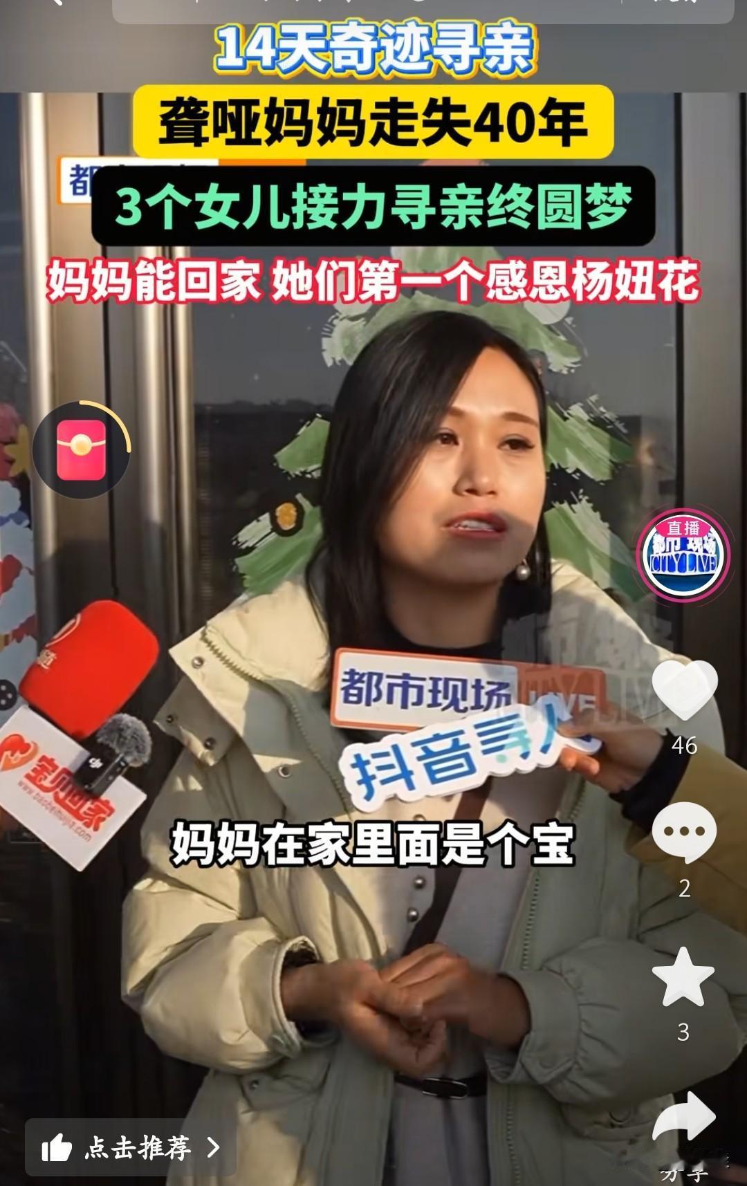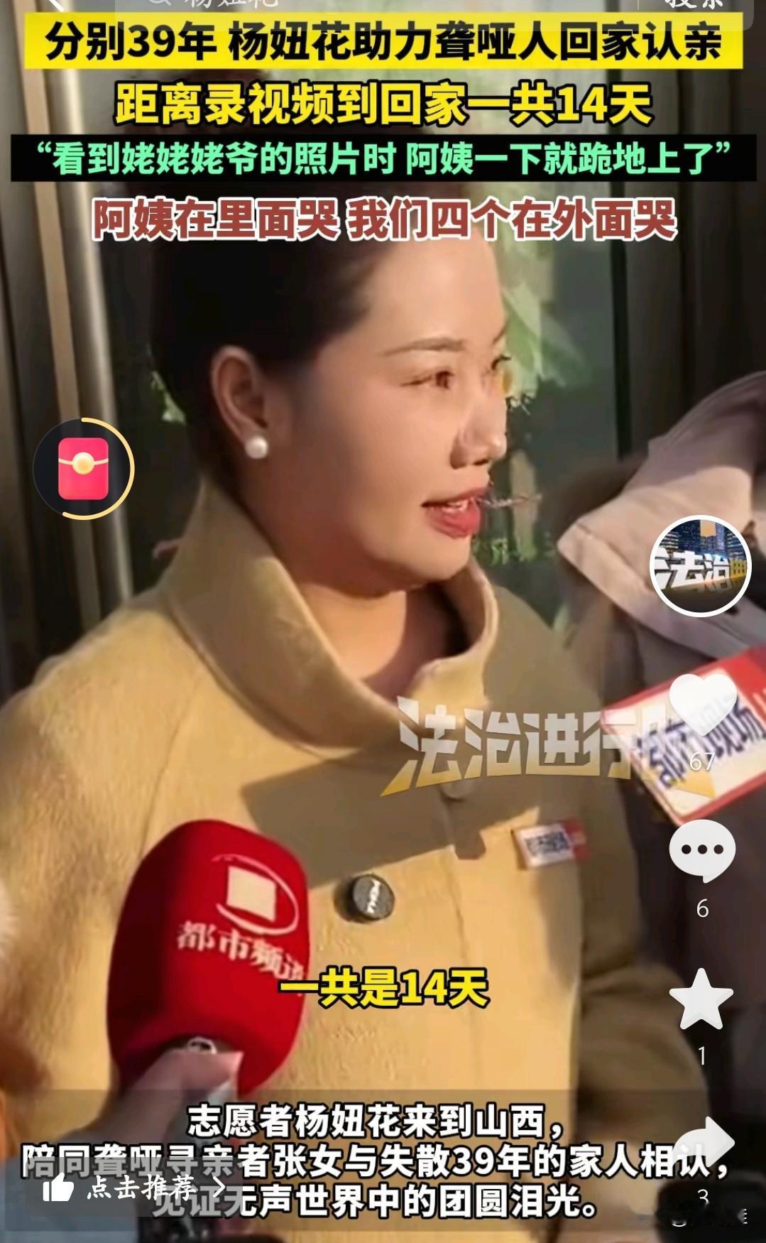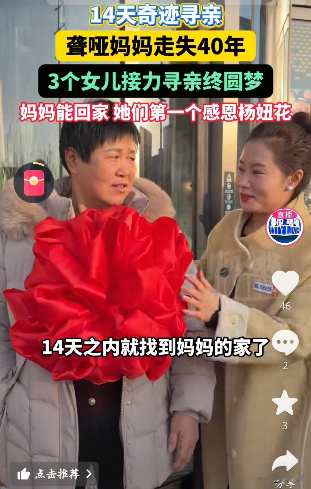 杨妞花又帮一位寻亲的阿姨找到了家!这位阿姨特别特殊,是个聋哑人,一丢就是39年。 说起来,她俩还是在杨妞花的直播间认识的。当时这位聋哑阿姨和她的三个女儿在直播间里疯狂刷屏,杨妞花才注意到,原来有这么一位特殊的阿姨在找家。她赶紧拍了个简短的视频,帮阿姨扩散寻亲信息。 没想到,这效率太高了,才用了14天,就帮阿姨找到了家人!当阿姨和她的亲姐姐联系上,姐姐发来爸爸妈妈的照片时,阿姨一看,“扑通”一声就跪在了地上,嗷嗷地哭了起来。那是压抑了39年的思念,终于在这一刻找到了归宿。 真是太让人感动了!为杨妞花的善良和坚持点赞,也祝福这位阿姨,终于可以回家了。