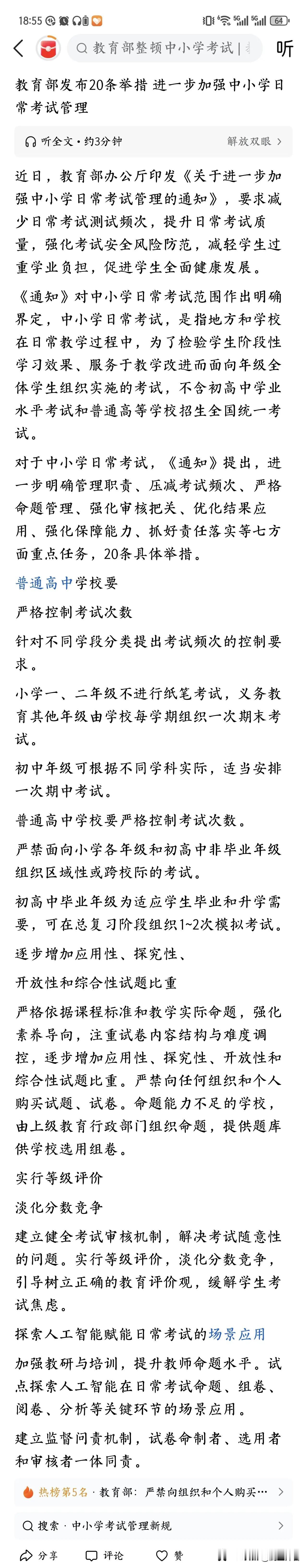 教育突然对中小学考试发布了限制措施!看了这个新闻最高兴的应该是学生吧!不考试,不排名,对于普通学生和差生来说,这简直是个天大的好消息。 好多学生苦考久矣,每次都害怕考不好,担心被老师批评,被父母责备。 现在教育部发文限制考试次数了,而且还不能给学生排名。具体怎么实行,学校、老师、家长都准备好了没有?