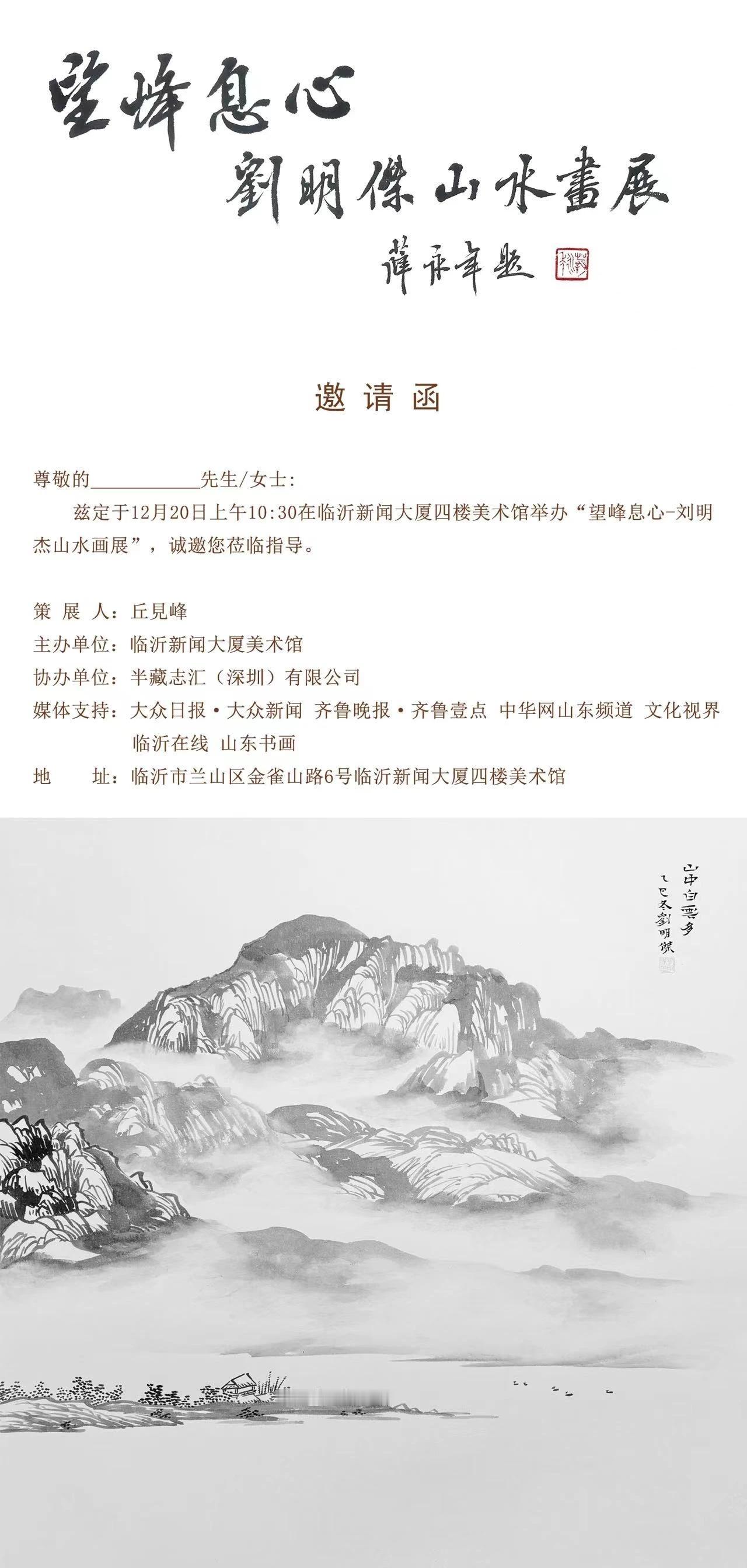 12月20日,“望峰息心——刘明杰山水画展”将在临沂新闻大厦美术馆举办。据了解,本次画展名称是由著名美术史学家、美术评论家薛永年先生题写,画展将展出刘明杰先生30幅山水画,皆为近日精心所作。欢迎大家留言文明交流!