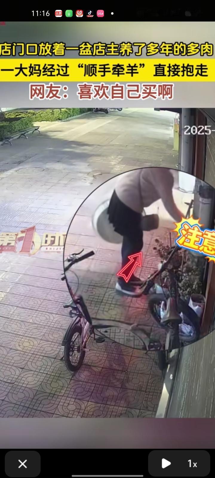 12月17日,大理州祥云县。店主晒出监控视频,店门口放着自己养了多年的多肉,有位陌生大妈“顺手牵羊”直接抱走。咱就是说,别人养的花真有那么香吗,喜欢花就自己买不好吗?