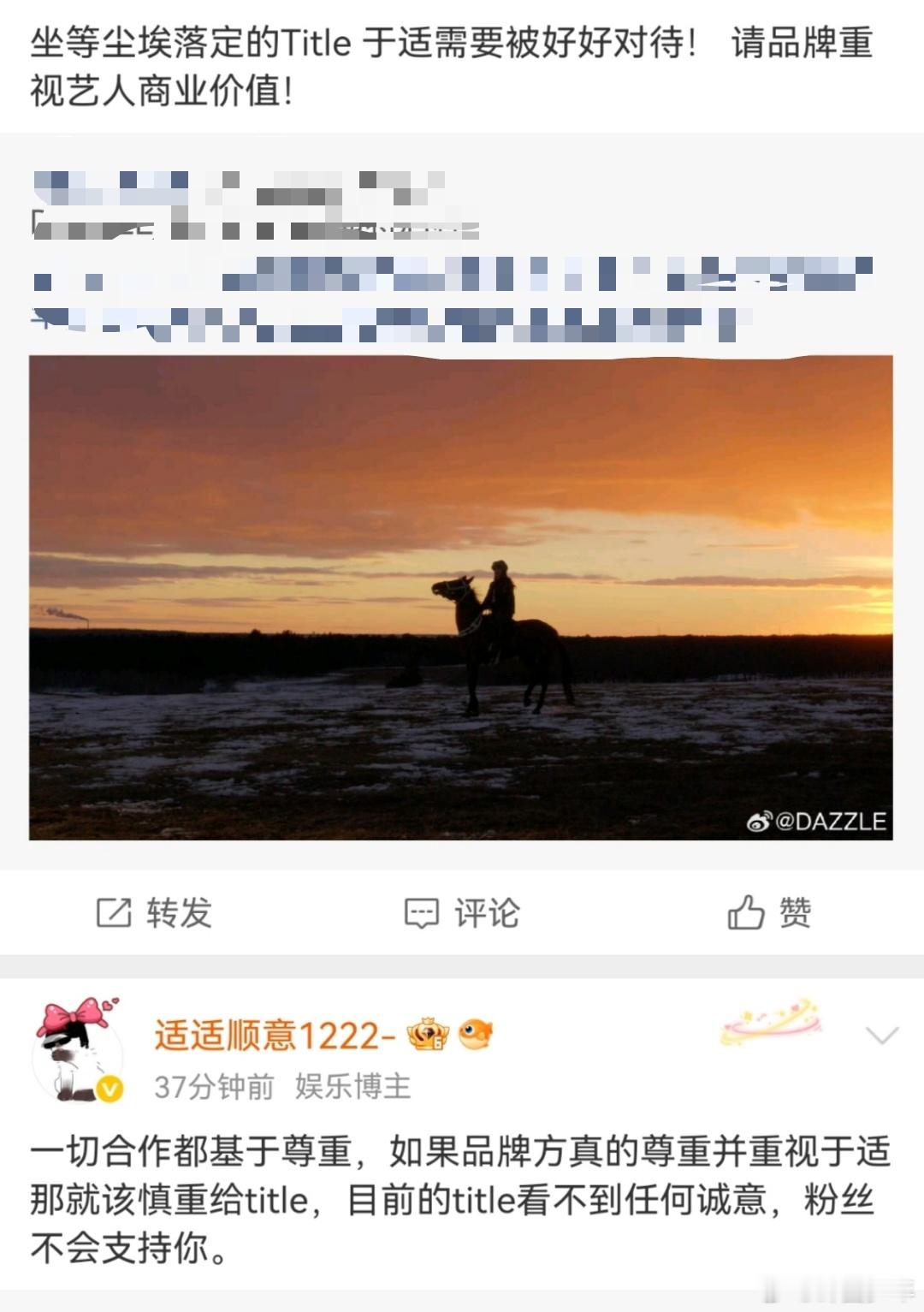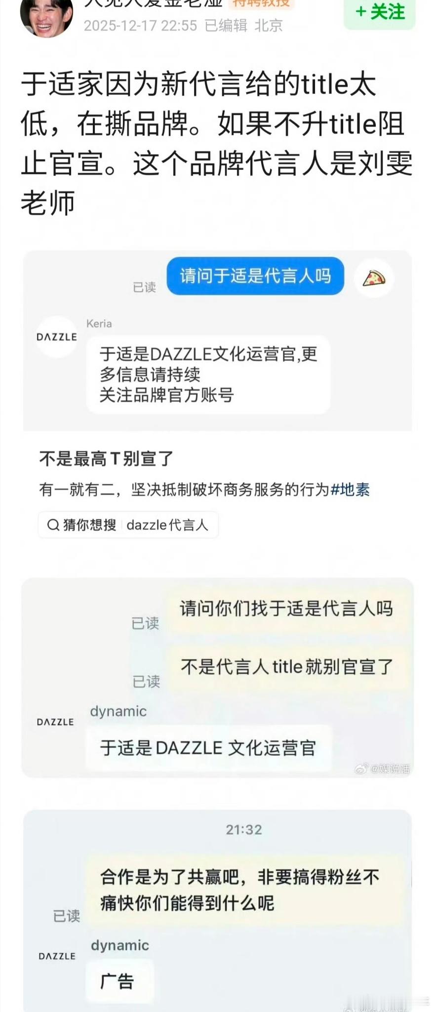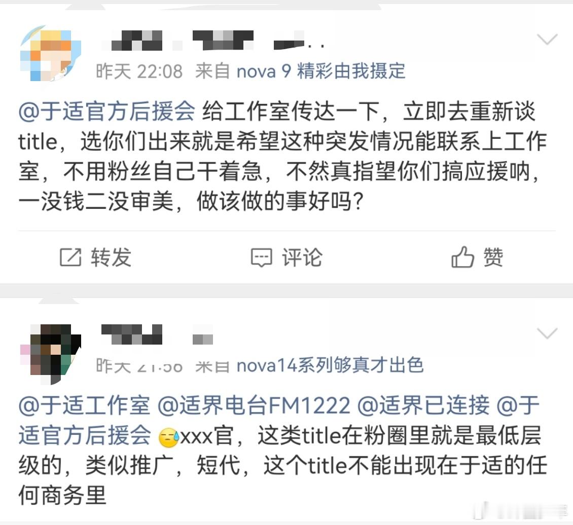 于适粉丝要求商务换title再官宣于适粉丝要求换title再官宣 于适粉丝就商务合作的title问题提出诉求,明确希望品牌方调整后再进行正式官宣,相关话题引发热议。