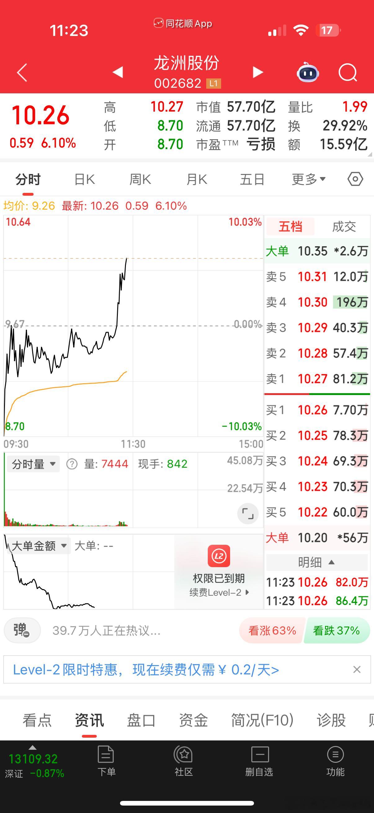$龙洲股份 sz002682$ 守得云雾见月明!有人顶不住压力,割肉出逃,今天反
