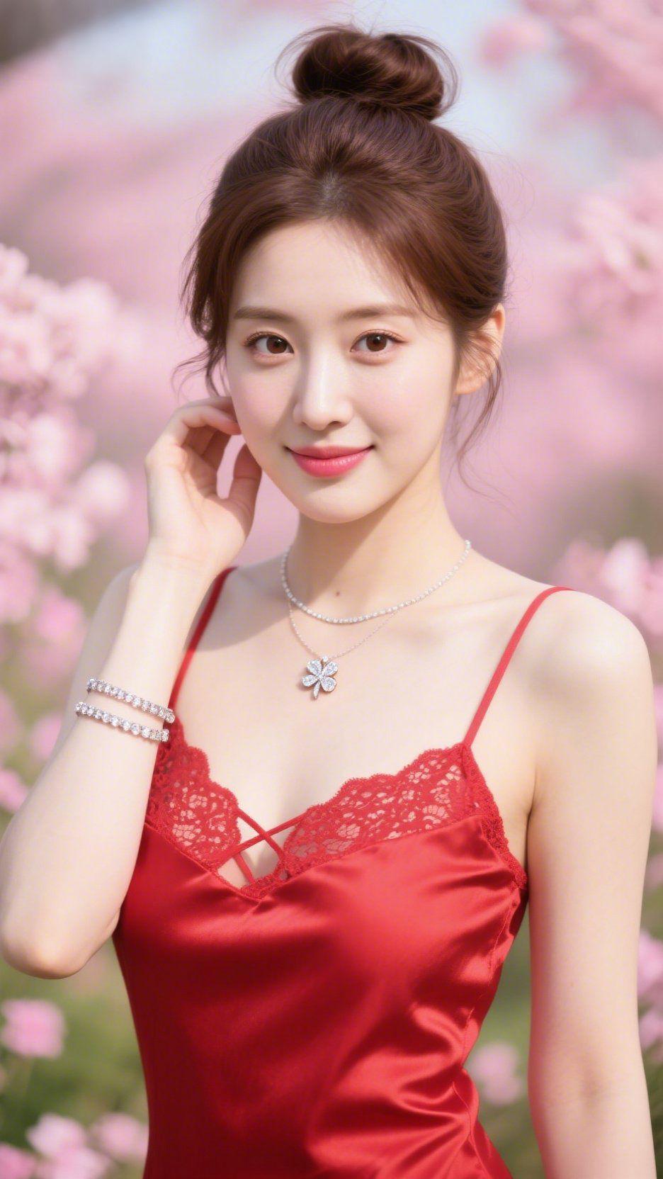 《红裙伴春樱》 粉樱织成朦胧的背景,她身着红裙立于风里,缎面的柔光裹着春的温软,蕾丝纹路像把细碎的亮意缀在了裙身。发梢松挽成圆髻,颈间链光与腕上晶饰,是落进眉目里的浅星。 笑意轻漾时,风也裹着软甜的气息——原来鲜活的明媚从不是张扬,是红裙与樱色相融的柔,是抬眼时眸底浸着的春景。 我们总在奔忙里裹了太多仓促,忘了这样的时刻有多动人:像把春天的柔,都揉进了这舒展的一眼里。 春樱轻氛围 红裙柔美学