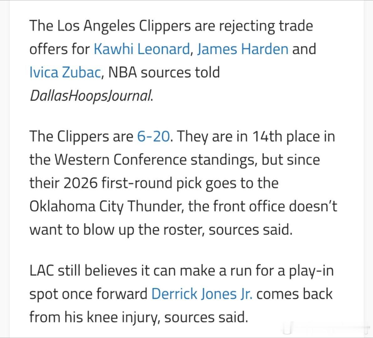 Ashish Mathur:快船拒绝了所有关于哈登,伦纳德和祖巴茨的交易,相信小琼斯回归后能冲击附加赛。快船于11月18日宣布小琼斯右膝内测副韧带扭伤,将在6周后复查,如今已过去4周。目前快船战绩为6胜20负,排名西部第14。但由于他们2026年的首轮选秀权已经送给了雷霆,因此管理层并不打算彻底推倒重建。
