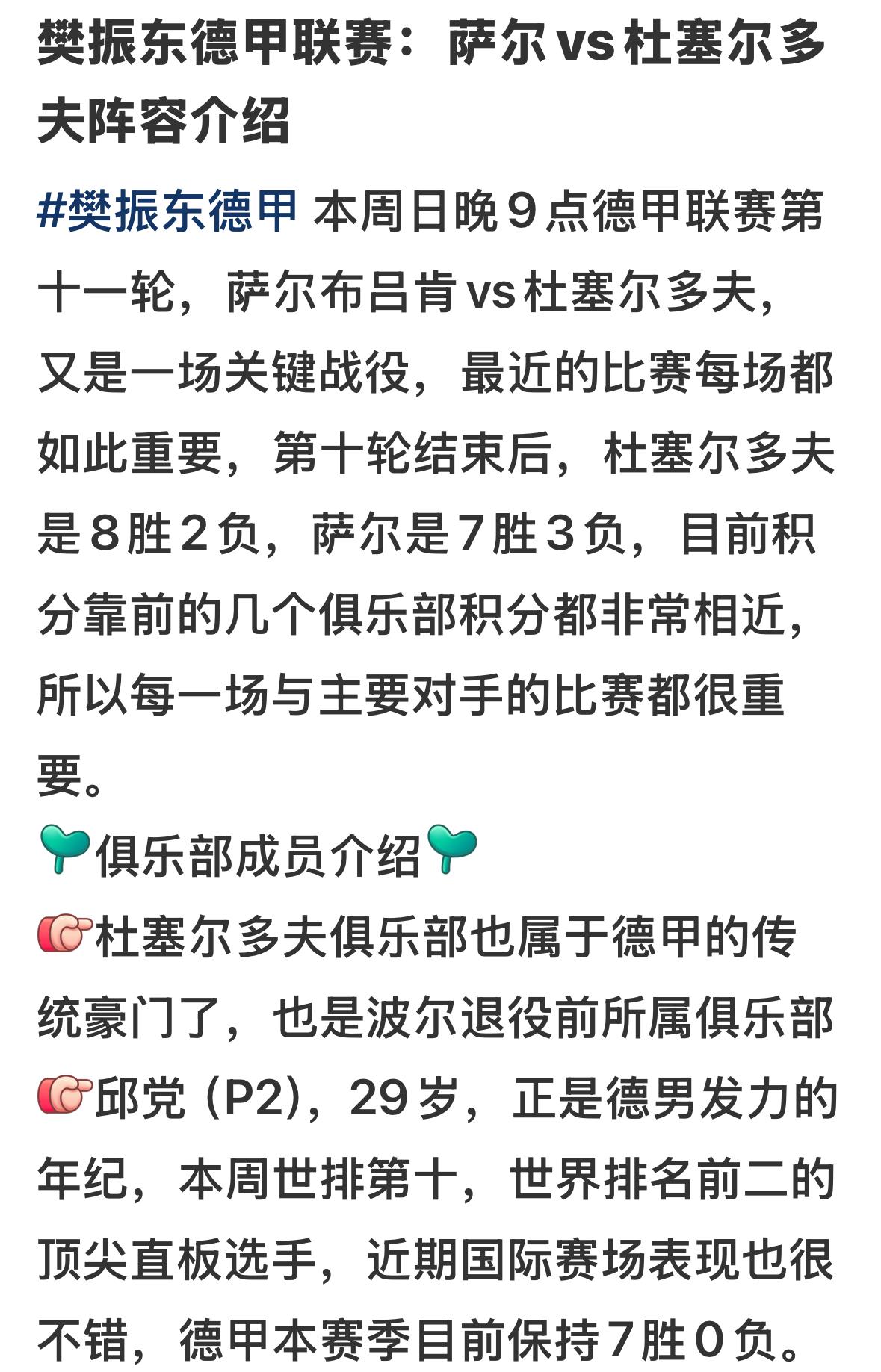 樊振东德甲本周日或出现樊振东VS邱党 精彩大战一触即发 本周日,也就是12月21日, 德甲联赛, 萨尔布吕肯VS杜塞尔多夫 本周日晚上9点, 德甲第十一轮, 萨尔布吕肯VS杜塞尔多夫, 太关键的一场战役, 第十轮结束后, 杜塞尔多夫是8胜二负, 萨尔是7胜三负, 樊振东回来了, 这次比赛是否能够扳平战绩, 太关键啦, 而且在对阵方面, 樊振东也许会对阵邱党, 邱党厉害👍, 最近状态不错👍, 德甲和乒超联赛一样, 最后也是剩下最后四支队伍角逐! 杜塞尔多夫队的实力明显很强, 萨尔加油, 12月21日,晚9点, 樊振东12月德甲第二战, 加油👏……