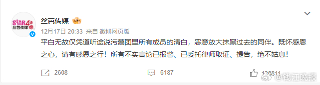 【#丝芭传媒报警#】17日晚,发文称:平白无故仅凭道听途说污蔑团里所有成员的清白,恶意放大抹黑过去的同伴。既怀感恩之心,请有感恩之行!所有不实言论已报警、已委托律师取证、提告,绝不姑息!#丝芭喊话鞠婧祎再不收手将实名举报##丝芭指控鞠婧祎严重经济犯罪#