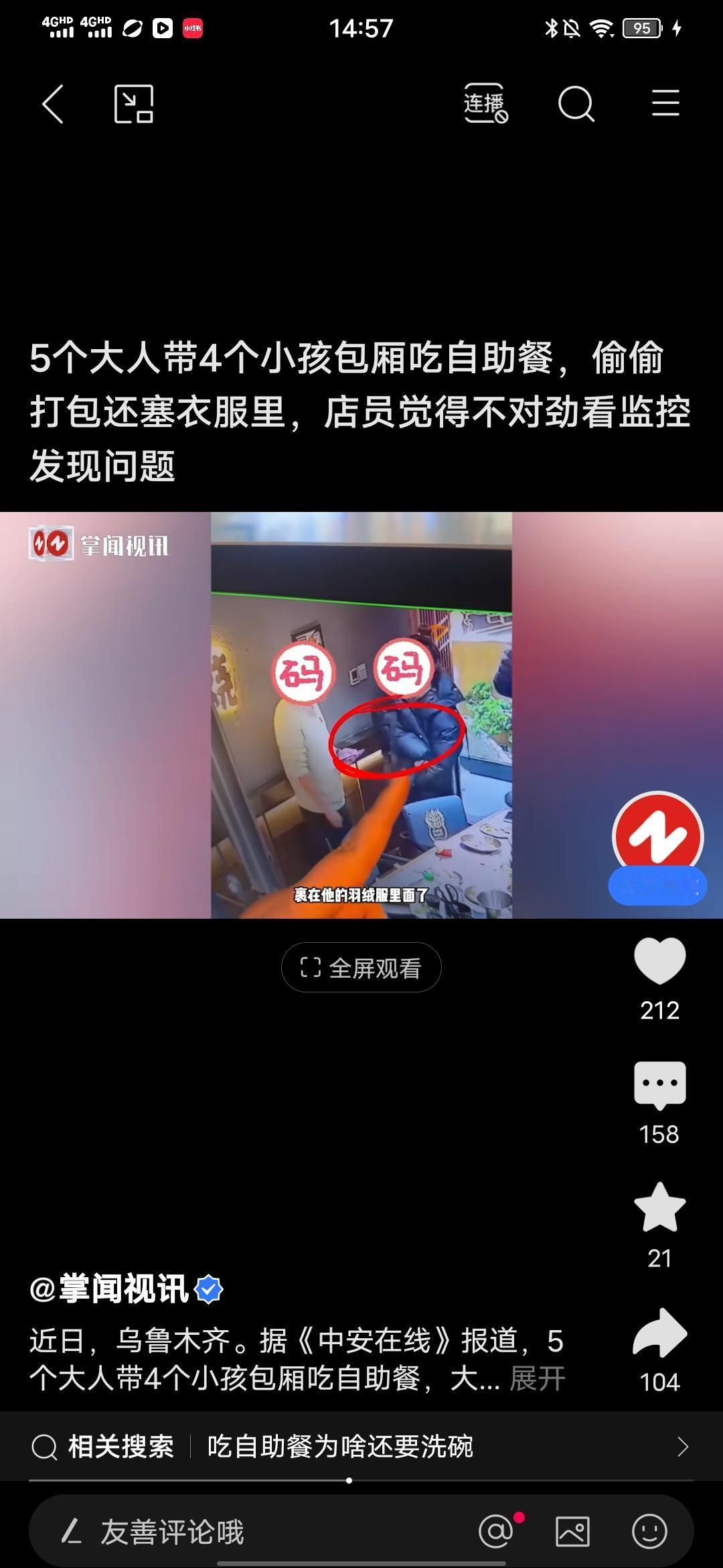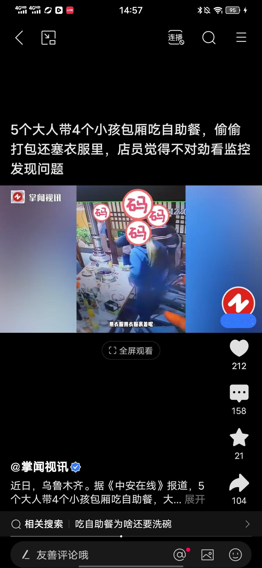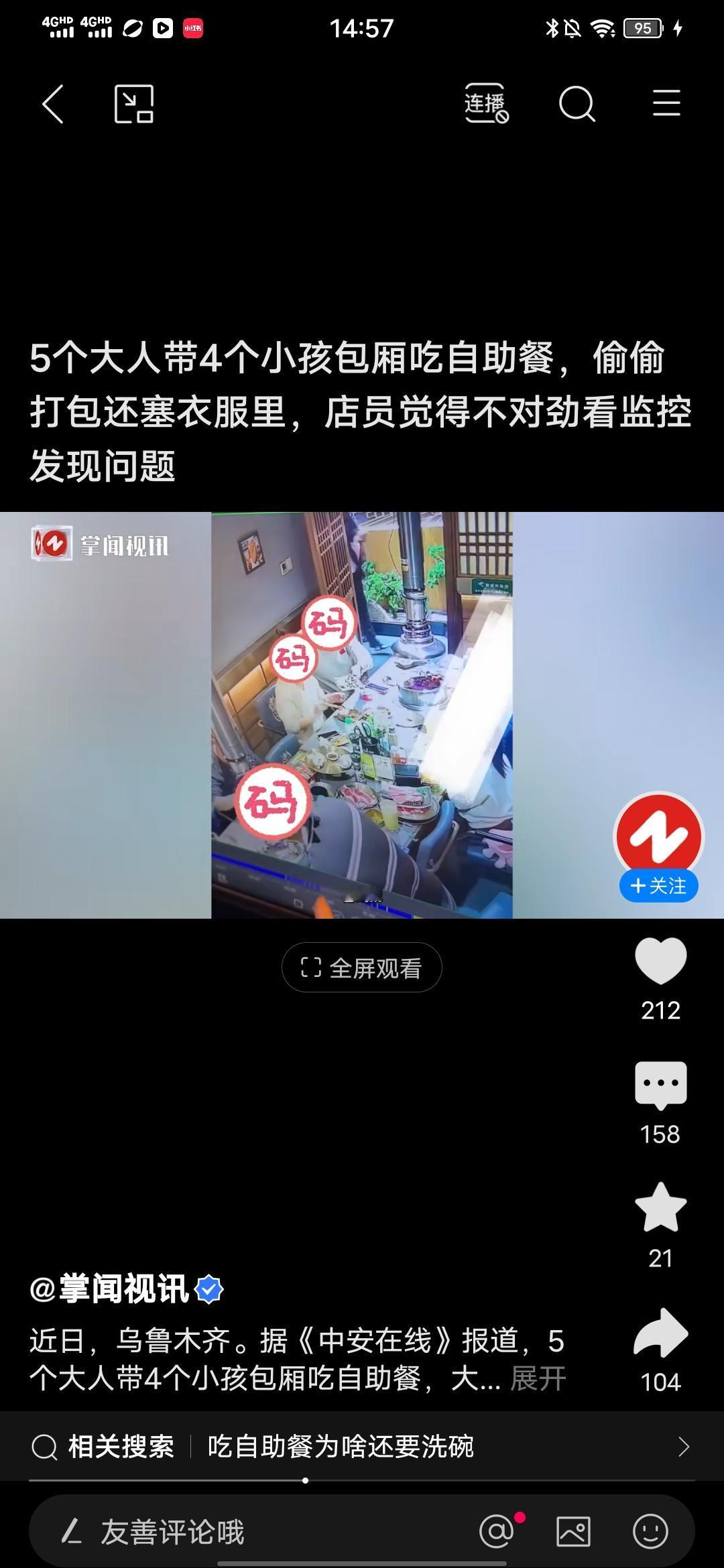 5个大人带4个小孩包厢吃自助餐,偷偷打包还塞衣服里,店员觉得不对劲看监控发现问题。 这是在掌闻视讯看到的消息,说的是近日,在乌鲁木齐,据《中安在线》报道,5个大人带4个小孩包厢吃自助餐,大人小孩一起偷偷地边吃边打包,打包五大袋塞满满的,还塞衣服里,店员觉得不对劲查看监控发现问题,“老顾客,这样能给孩子做好榜样吗?”。 其实这样挺掉价的,为了这口吃的,至于吗?贪了这点小便宜还能发财不成,丢不丢脸?在这样的耳濡目染之下,孩子会有怎样的价值观?会有什么安身立命的真本事?人都怕要养歪了。 想打包,或者觉得小孩子吃自助餐不划算,那何必去吃自助餐,去吃点餐就好啊,吃多少点多少,点了吃不了的打包再走,那体现的是不浪费事物的品质,可这自助餐,原本就是吃多少拿多少,谢绝打包的,这本就是自助餐从始至终的规矩,不要让孩子养成不劳而获的劣根性啊! 都是有孩子的人了,更应该懂得给孩子树立一个正确的价值观,难道你们希望自己的孩子以后真本事没有,就靠贪小便宜致富?痴心妄想,往往犯大事的人,都是从犯小事把贼胆养大的,到时候到了大事再来后悔,那就晚了。 都说父母是孩子第一任老师,做父母的言传身教,一定要特别注意规范自己的言行举止才行。
