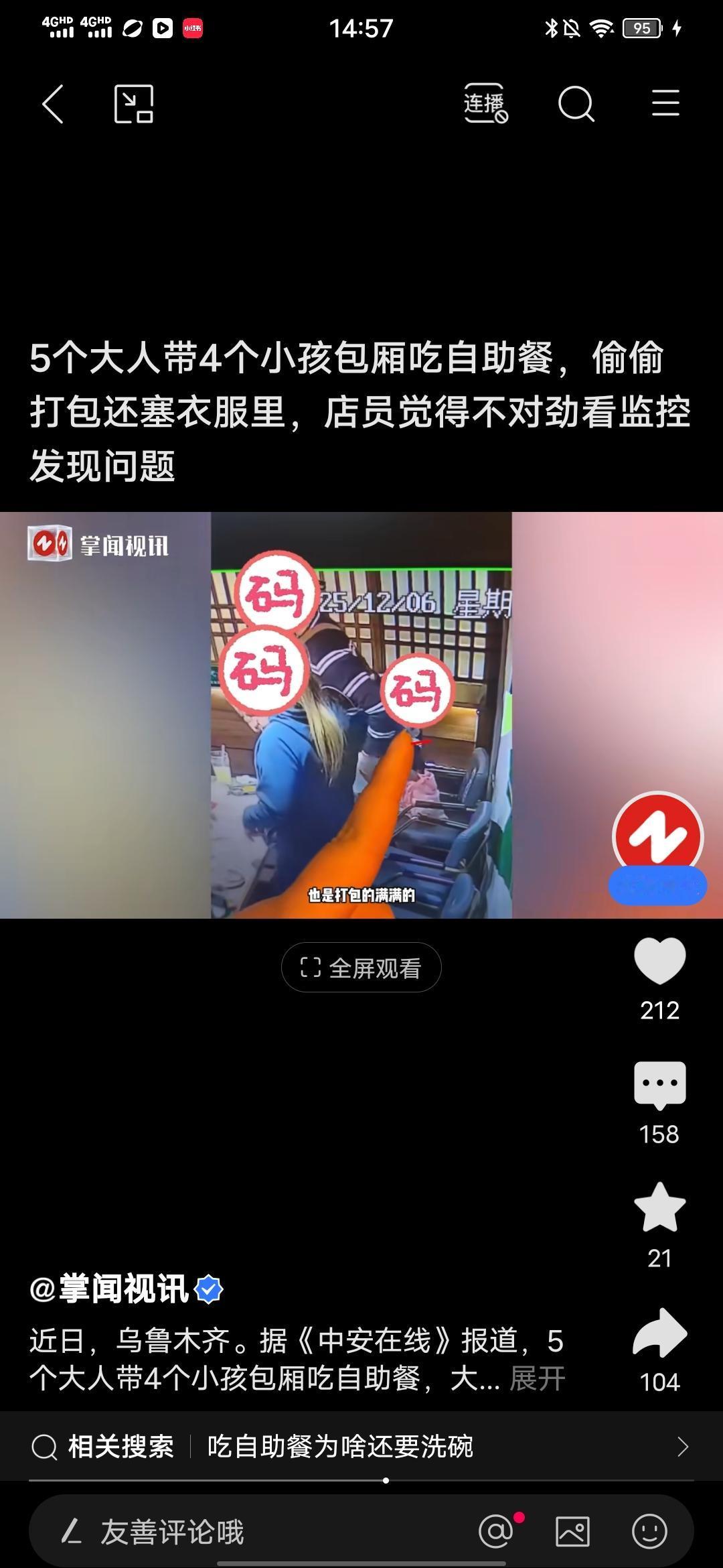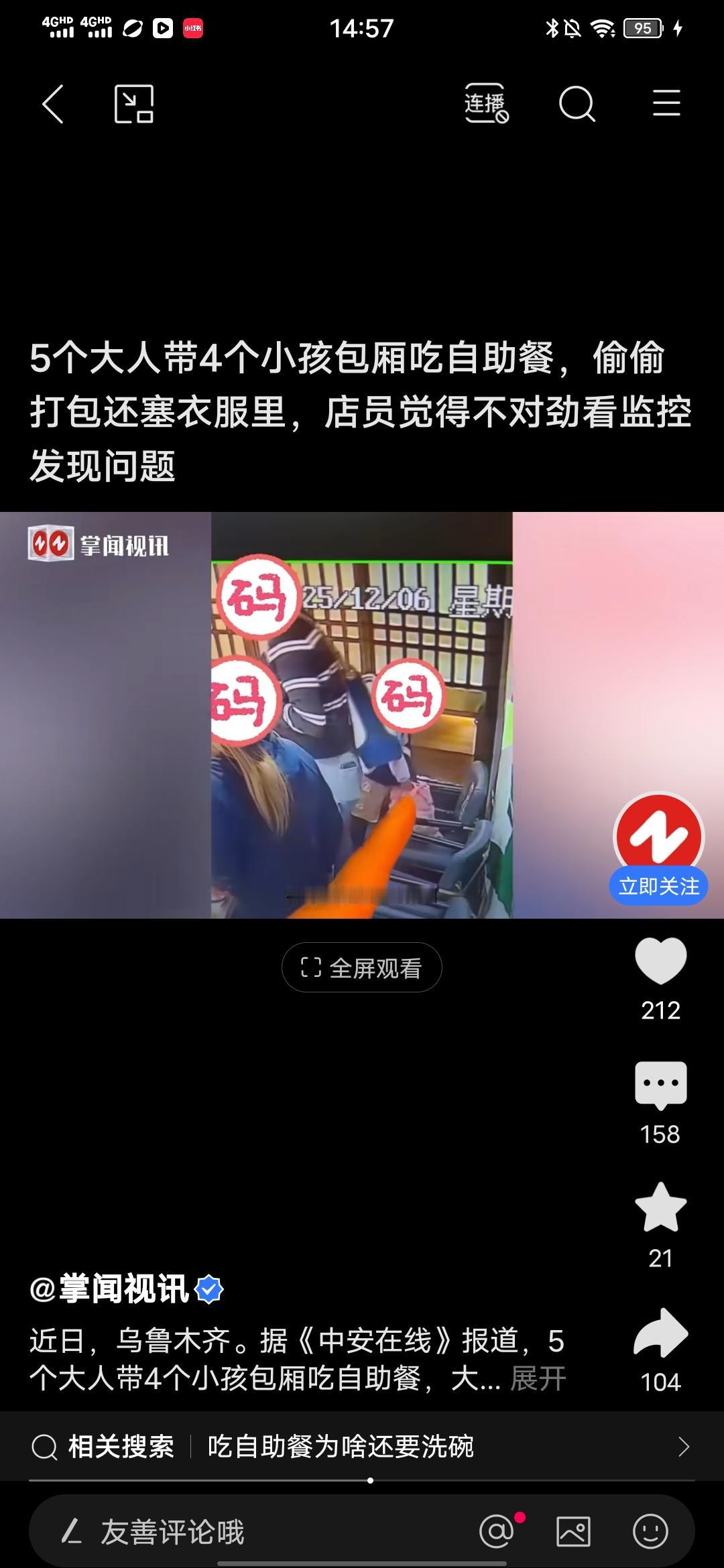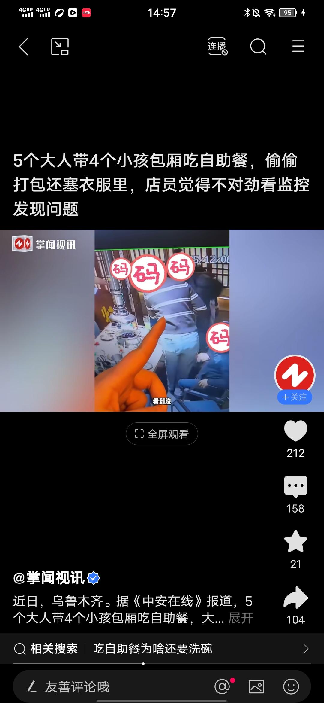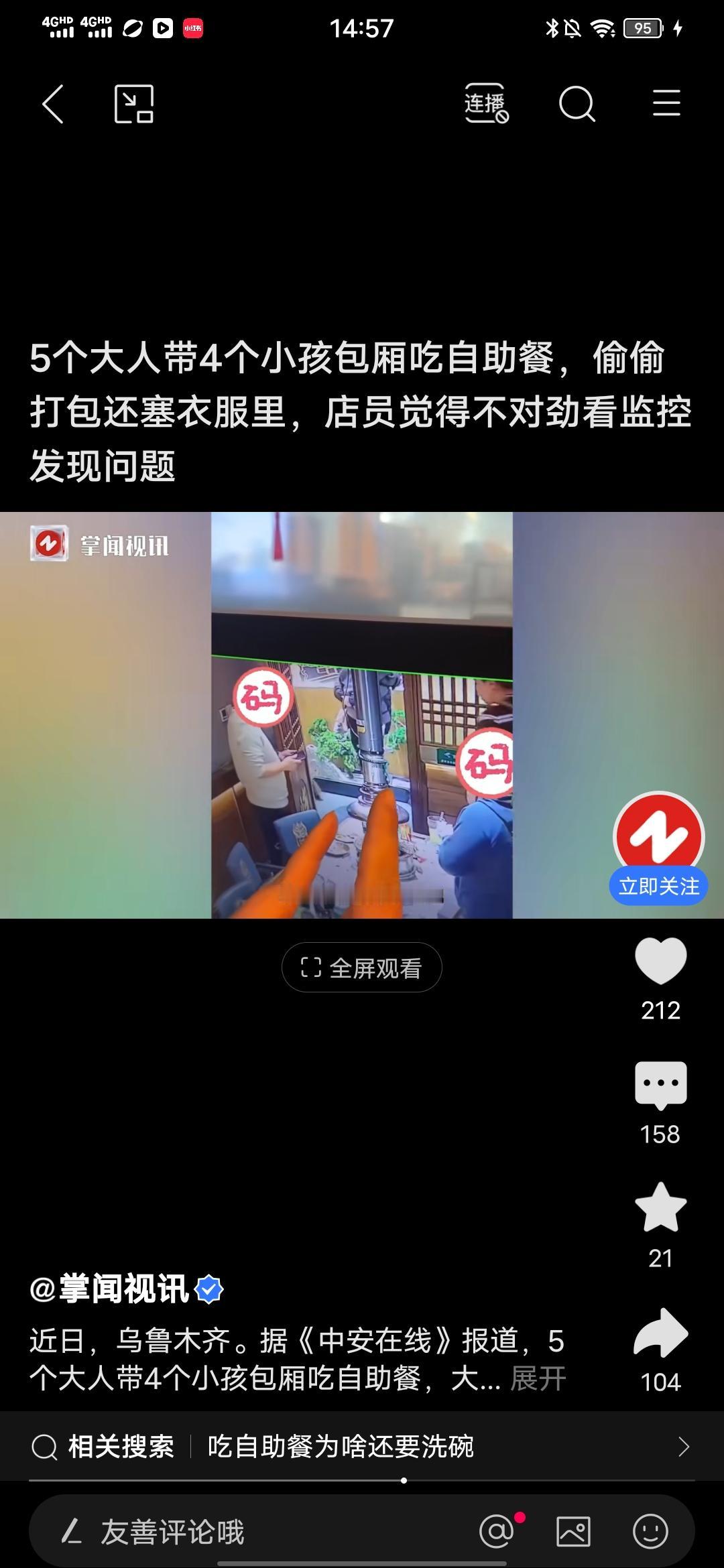 5个大人带4个小孩包厢吃自助餐,偷偷打包还塞衣服里,店员觉得不对劲看监控发现问题。 这是在掌闻视讯看到的消息,说的是近日,在乌鲁木齐,据《中安在线》报道,5个大人带4个小孩包厢吃自助餐,大人小孩一起偷偷地边吃边打包,打包五大袋塞满满的,还塞衣服里,店员觉得不对劲查看监控发现问题,“老顾客,这样能给孩子做好榜样吗?”。 其实这样挺掉价的,为了这口吃的,至于吗?贪了这点小便宜还能发财不成,丢不丢脸?在这样的耳濡目染之下,孩子会有怎样的价值观?会有什么安身立命的真本事?人都怕要养歪了。 想打包,或者觉得小孩子吃自助餐不划算,那何必去吃自助餐,去吃点餐就好啊,吃多少点多少,点了吃不了的打包再走,那体现的是不浪费事物的品质,可这自助餐,原本就是吃多少拿多少,谢绝打包的,这本就是自助餐从始至终的规矩,不要让孩子养成不劳而获的劣根性啊! 都是有孩子的人了,更应该懂得给孩子树立一个正确的价值观,难道你们希望自己的孩子以后真本事没有,就靠贪小便宜致富?痴心妄想,往往犯大事的人,都是从犯小事把贼胆养大的,到时候到了大事再来后悔,那就晚了。 都说父母是孩子第一任老师,做父母的言传身教,一定要特别注意规范自己的言行举止才行。
