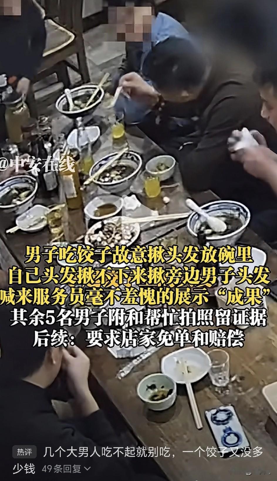 “碰瓷式吃饭”升级版!“男团”吃饭为免单竟拔头发当“道具”,老板气笑:他们上个月还嫌饺子太辣! 12月17日,北京。凌晨某餐馆里,一桌六名男子正在吃汤饺。 突然,一男子对着碗里的汤饺突发“戏瘾”——只见他狠揪自己头发未果,转身竟从同伴头上薅了一根,潇洒丢进碗里,然后举起“证物”理直气壮喊服务员:“你们卫生咋搞的?!” 更绝的是,同桌另外5人瞬间进入“角色”:有人拍照“取证”,有人帮腔施压,一套操作行云流水,把店家都给整懵了。最终,这桌消费149元的饭钱全免。 店主王先生事后调监控才惊觉:“这伙人里有3张熟脸!8月份就来过,点酸汤水饺却投诉‘太辣’——可咱们酸汤水饺本来就是辣的呀!” 服务员因觉眼熟起疑查监控,才揭穿这出“头发栽赃计”。 网友调侃: “建议申报‘诈骗团伙最敬业奖’,为了149元又是练手速又是当演员。” “别人吃饭费钱,这伙人吃饭费头发。” “几个大男人吃不起就别吃,一个饺子又没多少钱!” “这个以后不需要打码,让世人都看清他的嘴里。” “这个视频就告诉我们什么叫‘物以类聚,人以群分’”。 “人家小本生意,你们也好意思的?难怪你们发不了财!” “这个视频大家必须点赞,要让他们的亲戚朋友看见……” “这种人就不能惯着,直接报警处理!” “要起诉他敲诈勒索罪,让他一辈子带个记号。” “人穷不可怕,怕的是心穷。” 目前商家已报警。提醒各位老板:遇到“戏精顾客”别急着免单,先留证据! 毕竟——“今天他能嫌饺子辣,明天就能送你头发,后天指不定从哪儿变出只蟑螂呢!” 信息来源于中安在线、板扎在线,侵联删!
