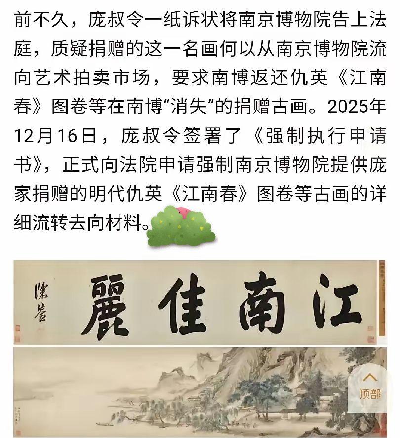 我有预感,南京博物院库房要起一场大火了,把账本目录等等那些东西烧个精光,原因你们懂的。博物院说的话更有意思: “经鉴定这5样东西是假的,所以我们就扔了。” 咦?你们说是假的,怎么还卖了8800万啊? 假的都这么值钱?? 说实话,看到这个新闻,我脑子里就冒出两个字:荒唐。 那把“火”烧没烧起来,没人知道。但人们心里的疑火,南博是越扑越旺了。就在昨天,他们总算憋出了一份“情况说明”。看完更让人糊涂了。 南博说,这5件画,包括那幅《江南春》,早在1961年和1964年就分别被专家鉴定为“伪”和“假”。然后在九十年代,“依照规定”给“处置”了。 这解释听着挺像那么回事。但你细品。 第一品:捐赠人庞家的鉴定水平,在收藏界是出了名的厉害,有句话叫“江南收藏甲天下,虚斋(庞家斋号)收藏甲江南”。这么厉害的人家,会看走眼,一口气捐5幅假画给你? 第二品:更巧的是,所有“被鉴定为假”的画,恰恰都是“不见了”的画。南博库房里其他132件都好好的,就这5件“假”的没了影。你说巧不巧? 南博提供的所谓鉴定材料,复印件上关键地方都打着“马赛克”。有媒体甚至扒出来,1964年鉴定组的成员里,有人根本不是书画鉴定专家,而是南博搞征集工作的工作人员。这样的鉴定,能让人信服吗? 还有更打脸的。就在2014年,南博自己还举办过庞家藏品的专题展览,把“虚斋旧藏”捧上了天,说它们“流传有序”、“鉴定严谨”。怎么十年不到,当年被你们隆重展出的宝贝,转眼就成了该被“扔掉”的假货? 最核心的问题来了:如果真是没价值的假画,扔了就扔了,谁会心疼?可现在,一幅一模一样的《江南春》,在拍卖行挂出了8800万的天价!能值8800万的“假画”,全世界收藏家恐怕都抢着要。南博这“扔”的哪是垃圾,扔的是金山啊! 他们倒也有句话说得对:“关于拍卖市场出现的《江南春》图卷是否为受赠画作,尚待进一步查证。” 是啊,得查!必须一查到底。但这查,不能是南博自己关起门来查。 有评论说得好,这件事暴露了博物馆管理上的三重硬伤。第一是程序不公,认定是假画,为什么不通知捐赠人一声?第二是责任失守,东西怎么没的,记录在哪里?第三是信任流失,对捐赠人家属多年的追问爱答不理,直到被告上法庭。 那把大家担心的“火”,其实早就烧起来了。它烧掉的是捐赠者对国家文博机构的信任,是公众对保管公共文化财富体系的信心。今天庞家可以因为画不见了打官司,明天其他捐赠者会不会寒了心,再也不敢把传家宝交出来? 好在,庞家后人已经向法院申请了强制执行,要求南博必须交出画的详细流转记录。法律,或许是刺破迷雾的最后一道光。 我们都在等。等一个清清楚楚的交代,等那5幅画的真实去向,等一个能让人重新相信的答案。这件事,不能就这么糊弄过去。因为烧掉的纸灰或许可以扫净,但人心里的灰烬,积久了,就再也捂不热了。