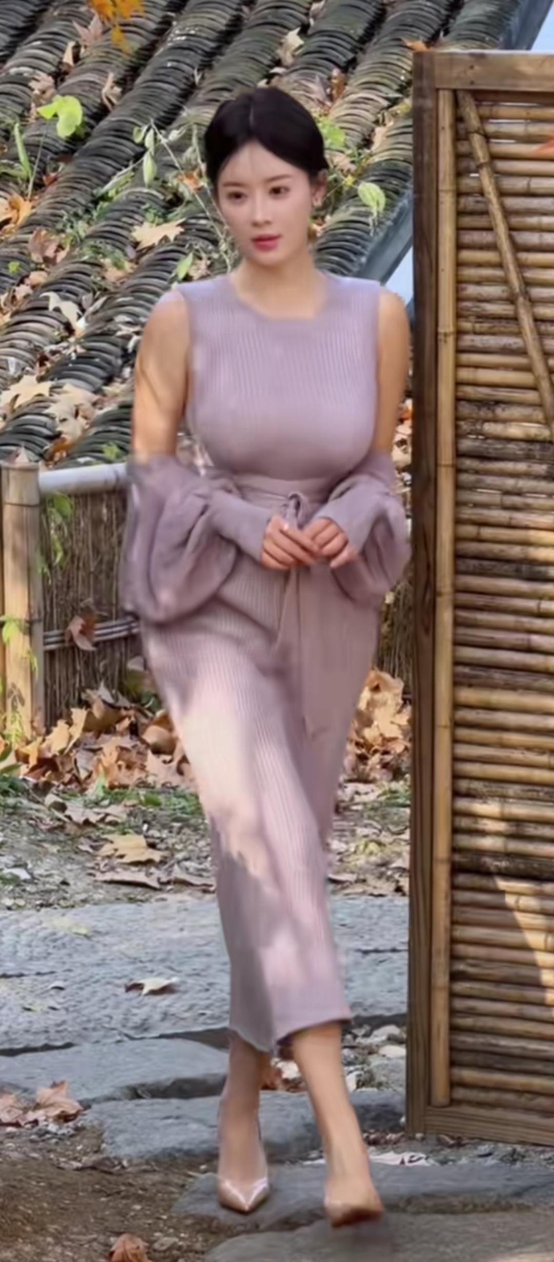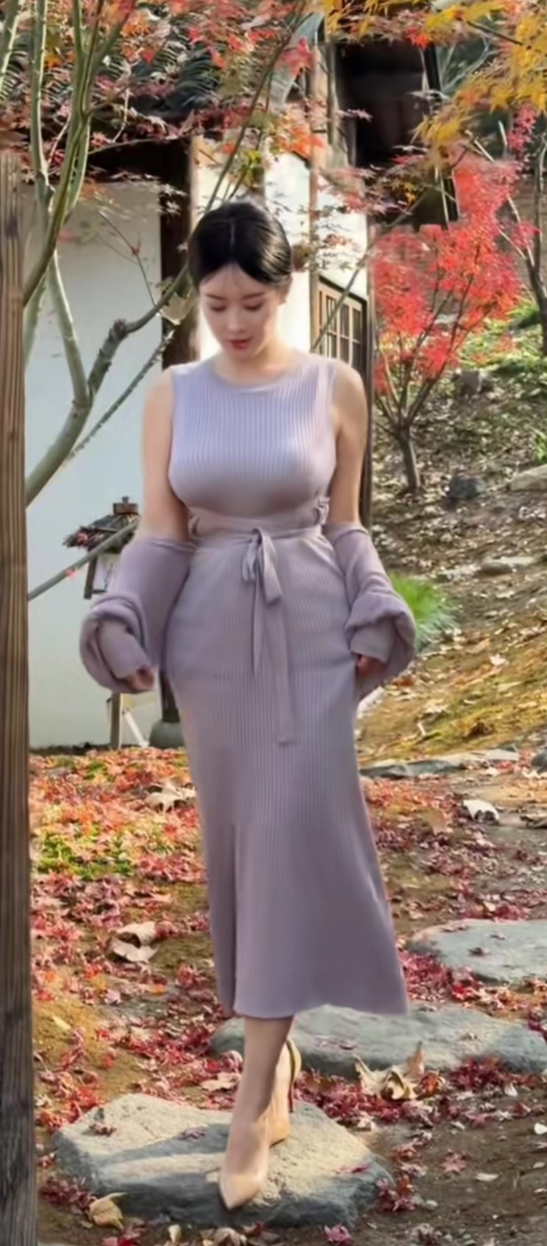 秋日漫步,浅紫裙摆,落叶飘零,优雅动人。