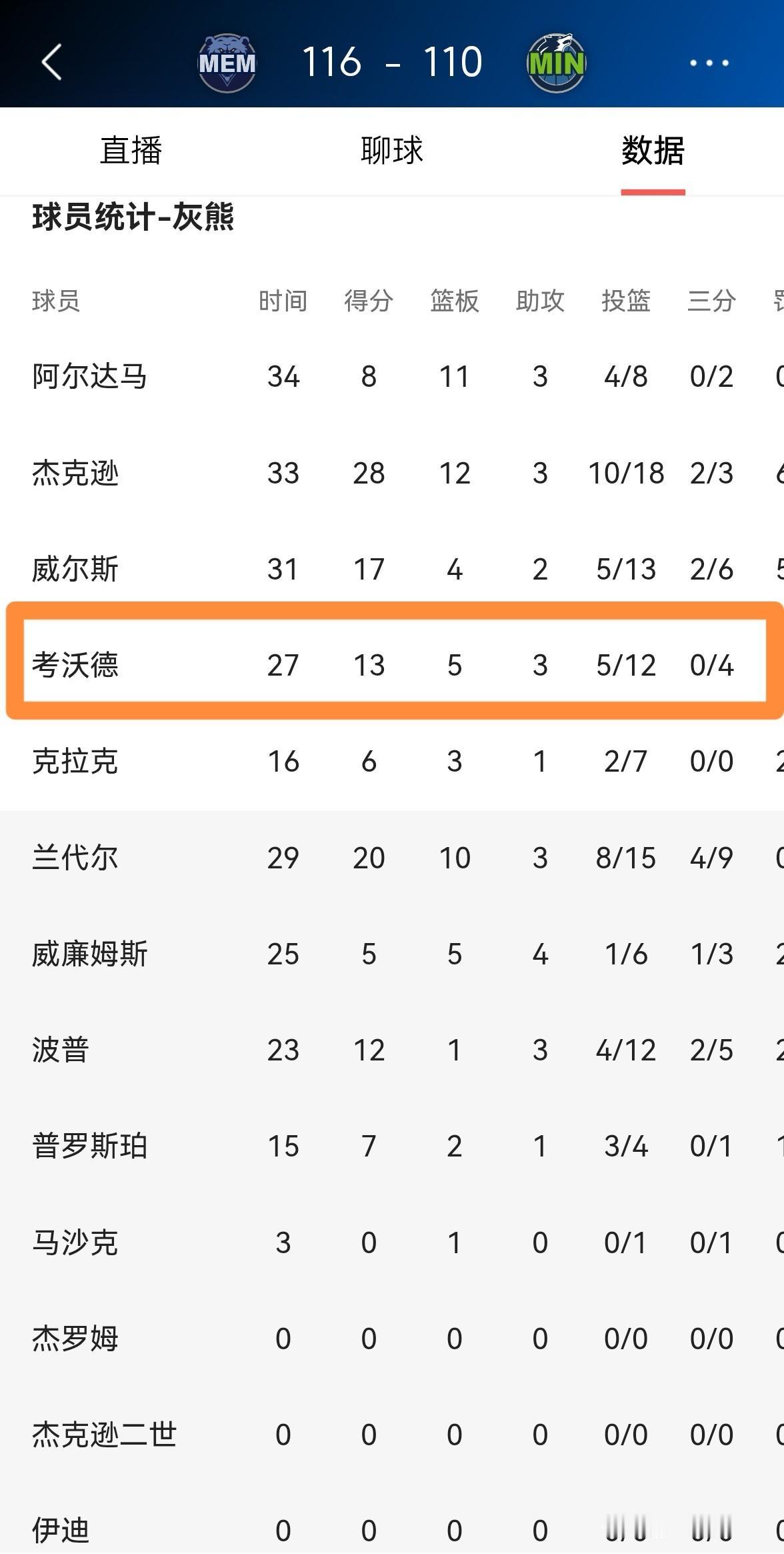 灰熊新秀考沃德真是初生牛犊不怕虎!在今天灰熊客场以116:110击败森林狼的比赛中,虽然小将考沃德的投篮手感一般,但是他敢拼敢打无所畏惧,展现出了青春力量。 全场比赛下来,考沃德首发出战27分钟,投篮12中5,其中三分球4中0、罚球3中3得到13分5篮板3助攻1抢断,不过有3失误,他的场上正负值为-10。 作为一名新秀,考沃德必须在接下来的比赛中提高自己的进攻效率并且减少失误,这样的话他才能竞争年度最佳新秀。
