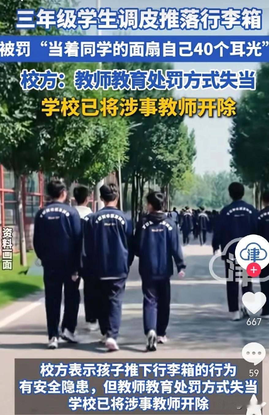 12月17日,山东郓城某一小学三年级的家长反应,自己孩子是调皮,不该把行李箱从楼梯滑下,但是也不该遭到老师让其当着同学的面自扇40个耳光。 近日,这位家长得知孩子被老师体罚后,立刻向学校举报老师的过激行为,校方了解到,事情发生在当日的中午,该学生看到楼梯没什么人,想着图省力,就把自己的行李箱从楼梯台阶滑了下去。 班主任知道后,觉得这行为有安全隐患,想给孩子一个教训,让他以后不敢再犯,于是就有了“自扇40个耳光”的操作。校方介入后也承认,这位老师的教育处罚方式确实太过激了,很快就把涉事老师开除了。 但这事看下来,越想越不是滋味。首先,孩子有错吗?肯定有。楼梯滑行李箱,万一撞到人或者自己摔了,后果都不堪设想,老师想教育他的初衷没问题。 可问题是,当着全班同学的面自扇耳光,一个三年级的孩子,自尊心正慢慢建立,这40个耳光下去,搞不好还会留下心理阴影,以后连学校都不敢进了,教训孩子的同时,老师还是该有适当的温度啊。 (图片来自网络视频)