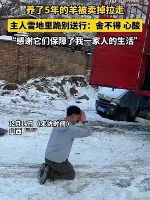 山西忻州一名男子将养了 5 年的羊卖掉,当所有羊都被装上车即将被带走时,男子再也忍不住了,直接跪在雪地上,双手合十,向所有羊送行告别。 谁能想到,一群羊能成撑起一个家的功臣?解师傅五年前揣着全部积蓄返乡养羊,每天风里来雨里去,赶羊上山、吆喝回圈,把小羊羔养成了大羊群,也靠它们凑齐了孩子学费、扛过了柴米油盐。 今年日子难,草料不够、开销又大,他只能忍痛卖羊。装车前喂饱每一只,细细刷干净羊毛,羊儿似懂分离,迟迟不肯上车。卡车开动的瞬间,他噗通跪在雪地里,三拜告别,红了的眼眶里全是不舍。 这哪是卖羊,分明是送别并肩熬过苦日子的家人。真正的感恩从不是空话,而是对陪伴与付出的郑重珍视。你有没有为某份陪伴红过眼?来评论区说说你的故事~