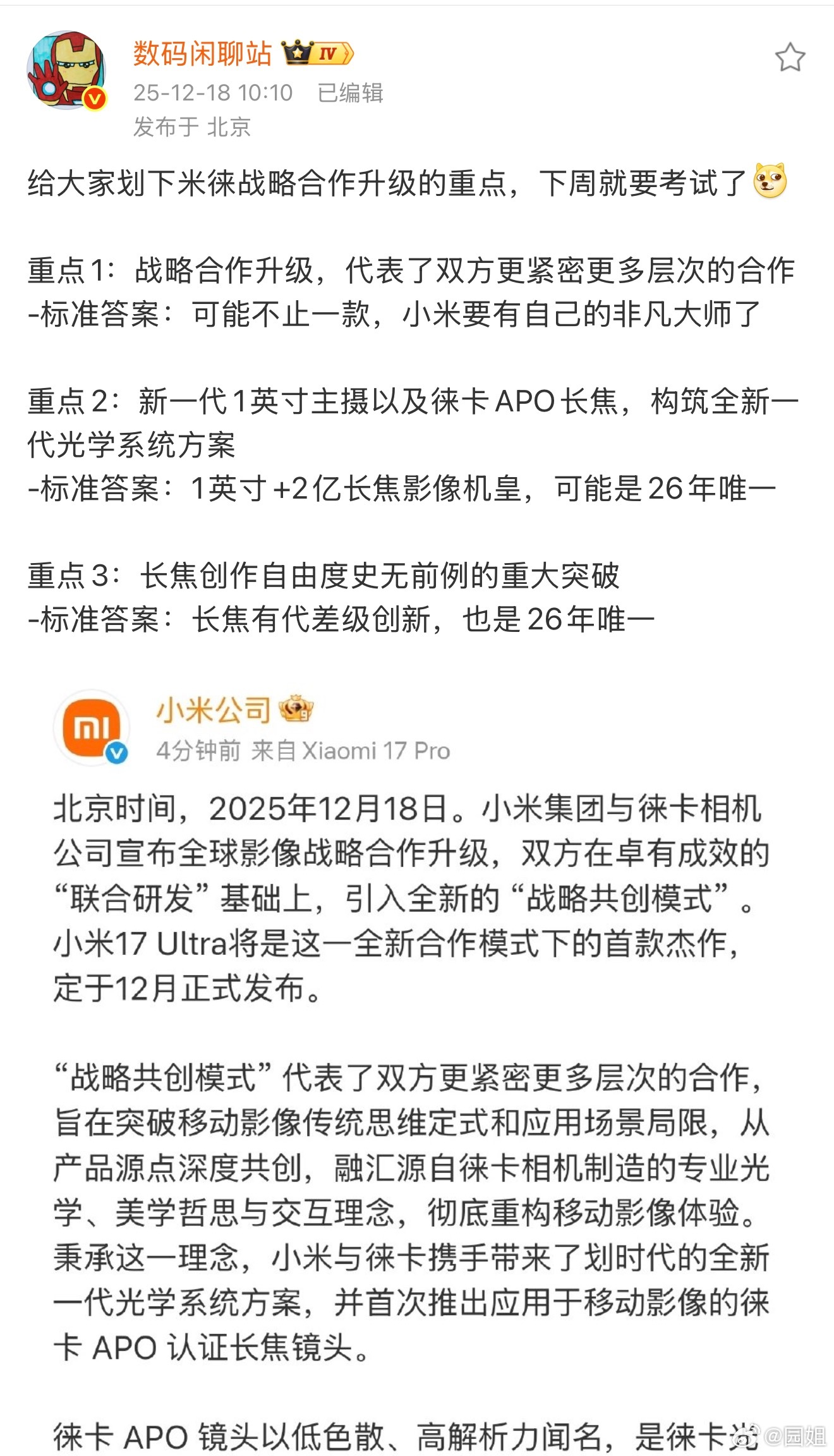 联合研发到战略共创?总不能是要给17 Ultra上红标版了吧。不过既然小米和徕卡的合作进一步升级,那估计这次小米17 Ultra除了以前的徕卡色调和徕卡水印外,应该能用上徕卡的胶片模式了,那才是正经的徕卡风味。而且这代Ultra也是首款用上徕卡APO认证的长焦,配合配合1英寸大底主摄与2亿像素连续光变,大光比场景下的表现估计会强很多了,毕竟这几年的影像Ultra可没有一英寸大底了。不过除了这个徕卡APO长焦,不知道会不会有别的合作产品,比如说之前那个M43的磁吸镜头?或者配合摄影套装的徕卡长焦增距镜?不过与其猜配置,价格肯定更值得关注。毕竟现在内存价格已经全面起飞,估计这代入门版的12+256能守住6K价位应该已经很不容易了,红标版估计得过万了吧。不过我有一计,给红标版单独起个名字,不如就叫金凡大师版吧。#小米与徕卡合作升级#