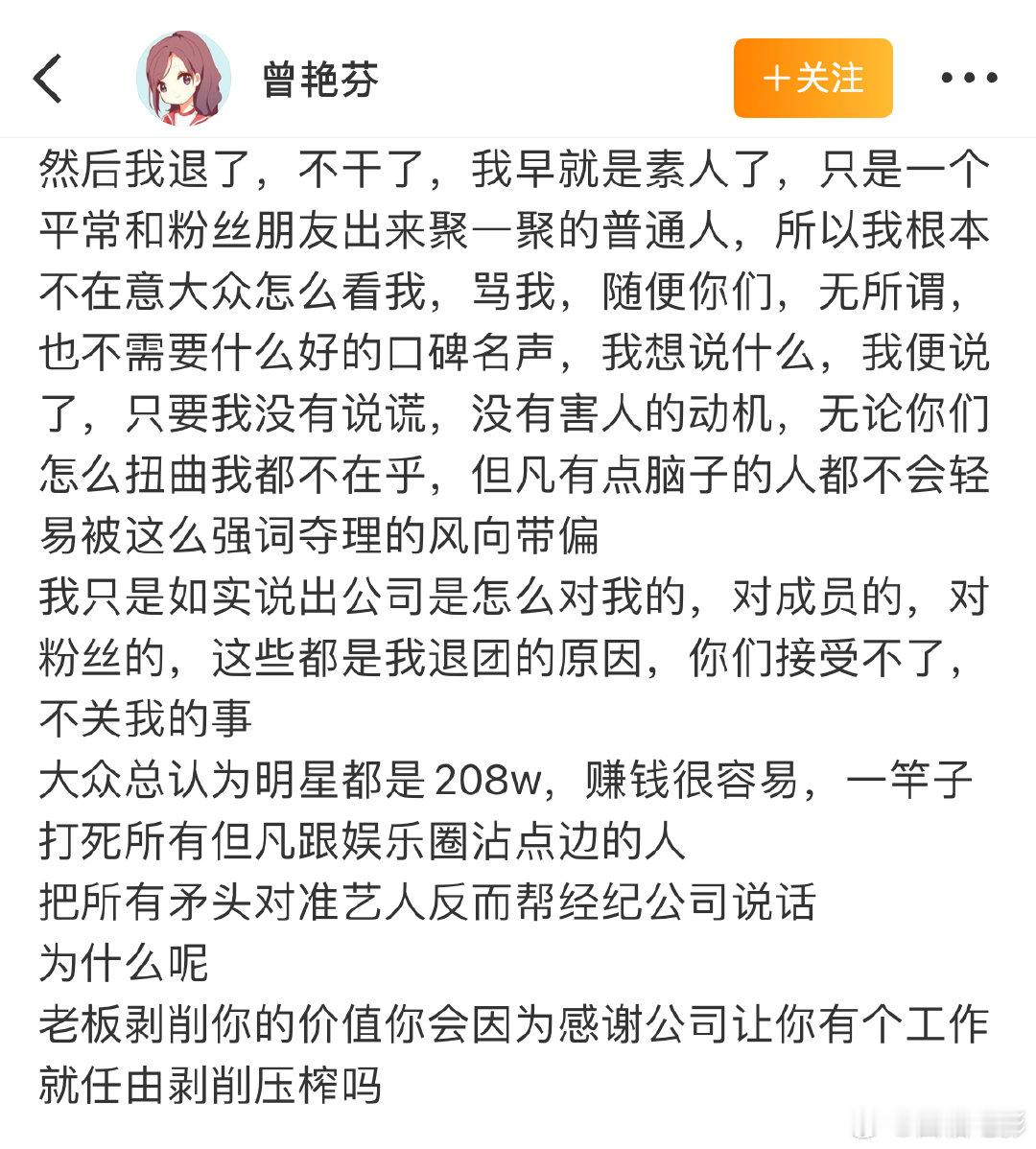 曾艳芬自曝工资曾艳芬谈丝芭工资 曾艳芬自曝工资!曾艳芬发文谈丝芭时期工资:“我13年进团13年14年的工资是180015年进圈后按名次发工资15年第9名我不太记得工资是多少了好像有800016年我第四名的工资是两万五还是三万17年我第六名工资是两万五而仅仅总选这一项我的粉丝就给我打投了七百多万,这些粉丝都有数据的。”