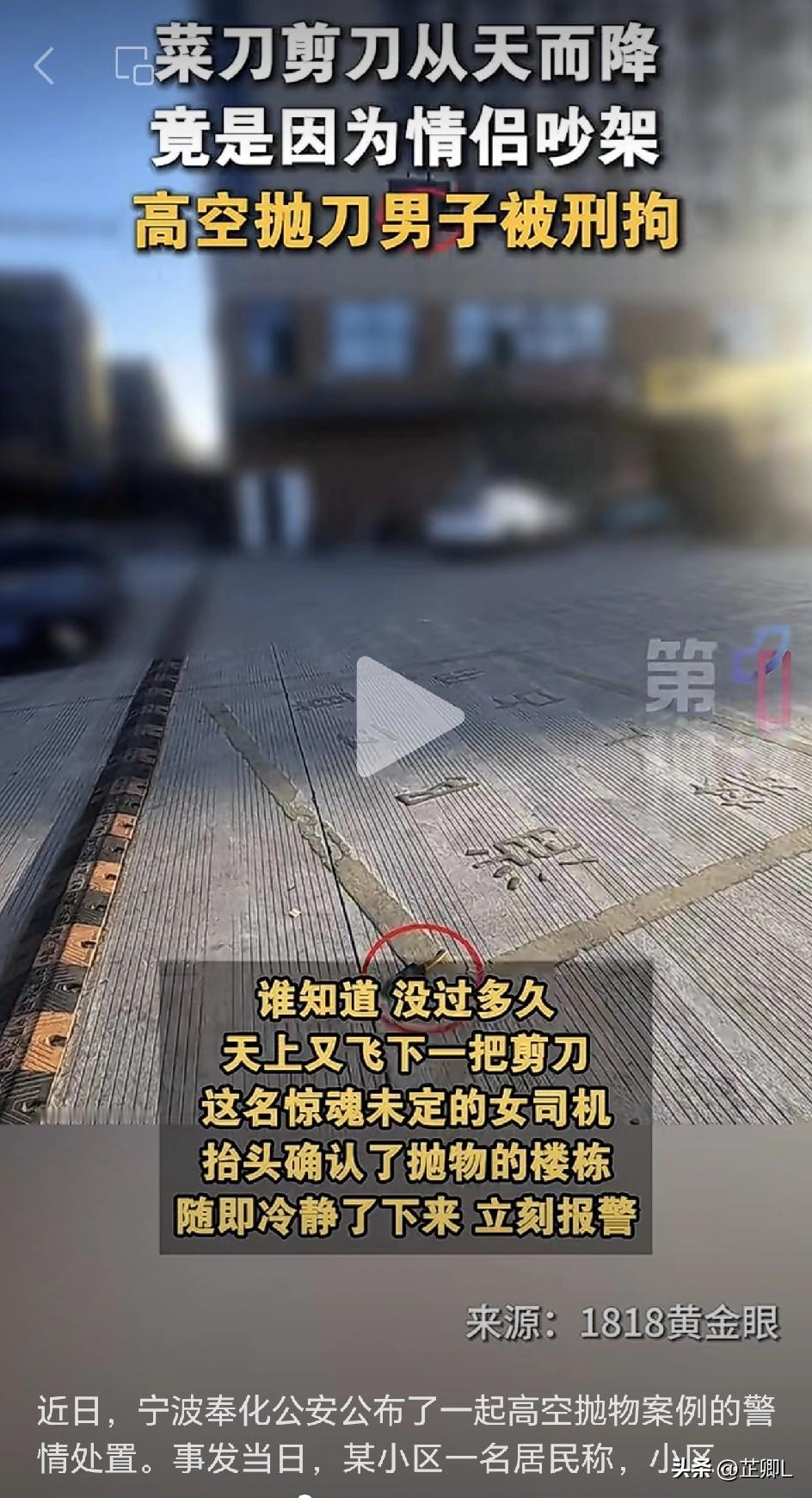 情侣吵架竟扔菜刀下楼!宁波女子倒车突遇“飞来凶器”,惊吓报警!网友:这是要拍武侠片? 11月29日中午,浙江宁波奉化区一女子刚坐进驾驶座准备倒车,突然“哐当”一声——一把菜刀从天而降,砸在车头前不到两米处! 还没等她回过神,紧接着又掉下来一把剪刀,女子吓得直接报警:“天上掉菜刀了!” 民警火速锁定“高空飞刀客”:原来是一男子王某和女友因钱的问题吵架,情绪一上头,竟把厨房“兵器库”搬到阳台——先扔菜刀,再甩剪刀,完全不顾楼下是不是“演武场”。 王某对其“天女散刀”的行为供认不讳,目前因涉嫌高空抛物罪被刑拘。 网友辣评: “这下好了,经济纠纷没解决,先喜提‘刑法体验套餐’。” “建议小区标语升级:‘吵架不扔刀,扔刀必坐牢’。” “古有李白笔落惊风雨,今有王某扔刀吓司机。” “这哪是高空抛物?这是‘高空抛刑’啊!” “能不能一直刑拘啊,他住高楼我害怕!” “这横祸挺扎人心的,大家以后出门顶个锅吧。” “核实后建议5年起步,看还有没有这种事情再发生!” “希望让那些高空抛物的人直接给他判个十年、八年的。” 艾玛,这以后倒车,不仅仅要看后视镜,看看前后左右,还得往天上看?谁知道天上会掉啥陷阱呢! 也实在理解不了,这种高空拋物的,吵架归吵架,你往楼下扔东西干嘛?东西得罪你了? 如果你非要扔东西,不扔就喘不上来气,为啥不把你家钱都从窗口扔下去呢? 反正都吵到要打砸家伙什了,不打算过了,直接把钱扔了一了百了!把东西扔了,钱还在,还能再买。把钱扔了,彻底啥都没了,就彻底不用过了! 说到底,高空抛物的人,也是有选择性的扔,他知道啥中用啥可有可无。就这选择让菜刀和剪刀“自由落体”的,性质绝对算得上恶劣。 他不知道这东西伤人啊?怎么可能!别说扔楼下,就是放桌上还有伤人的可能性呢,更何况是人来人往的小区。 所以,对这样的人绝对不能姑息! “如果你遇到高空抛物会怎么办?评论区支支招!” 信息来源于第一现场,侵联删!