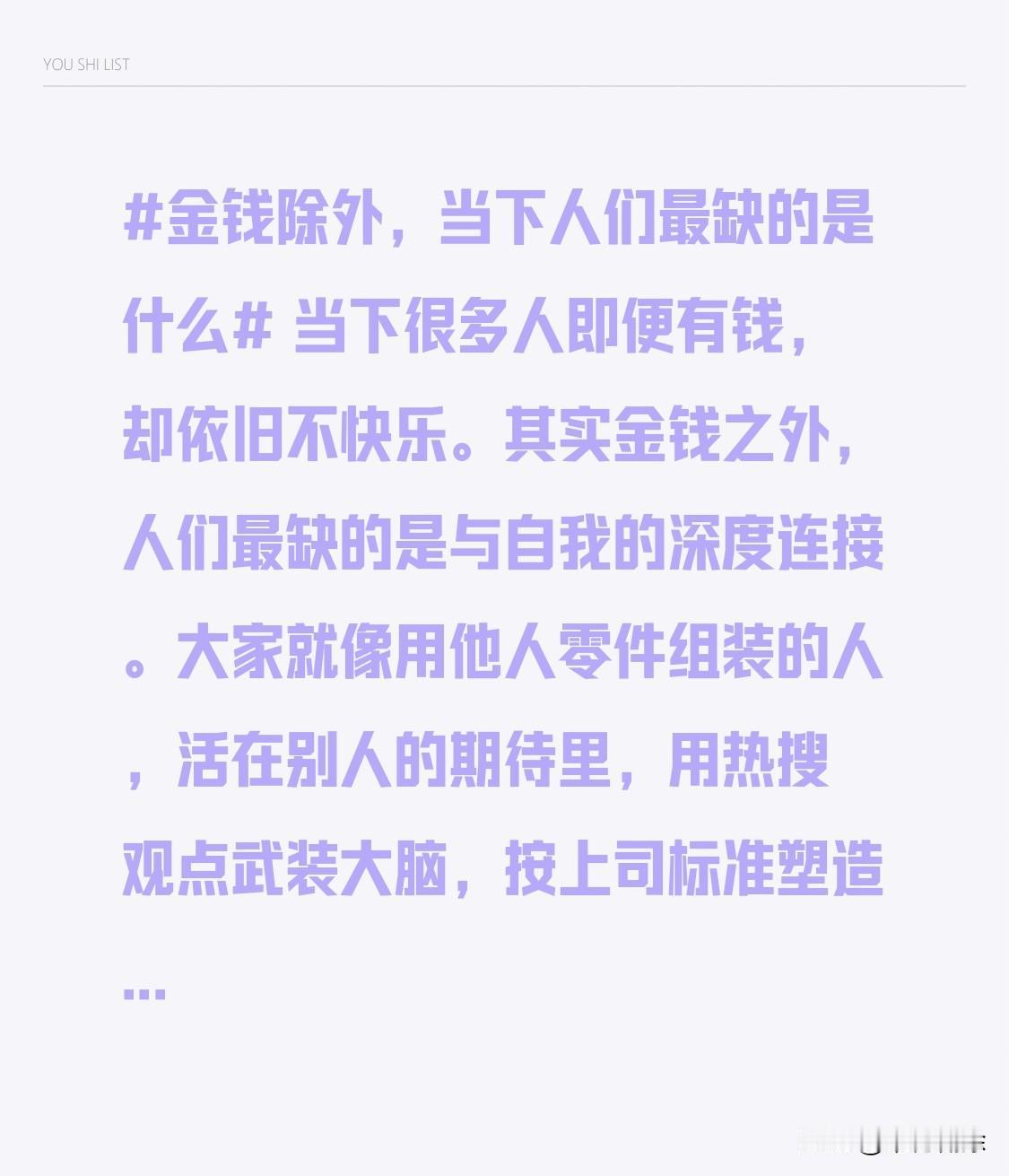 当下很多人即便有钱,却依旧不快乐。其实金钱之外,人们最缺的是与自我的深度连接。 大家就像用他人零件组装的人,活在别人的期待里,用热搜观点武装大脑,按上司标准塑造表情。灵魂如同合租房,住满别人的期待,自己却“无家可归”。 要找回自己,得拆掉不属于自己的零件,扯掉社会塞的价值观。用破碎野心、走丢热爱慢炖自己。记住,你的存在无需他人审批。 钱来自身外之物 钱不是唯一标准 对金钱的理解 对金钱的概念 缺钱感悟 对金钱的思考 金钱