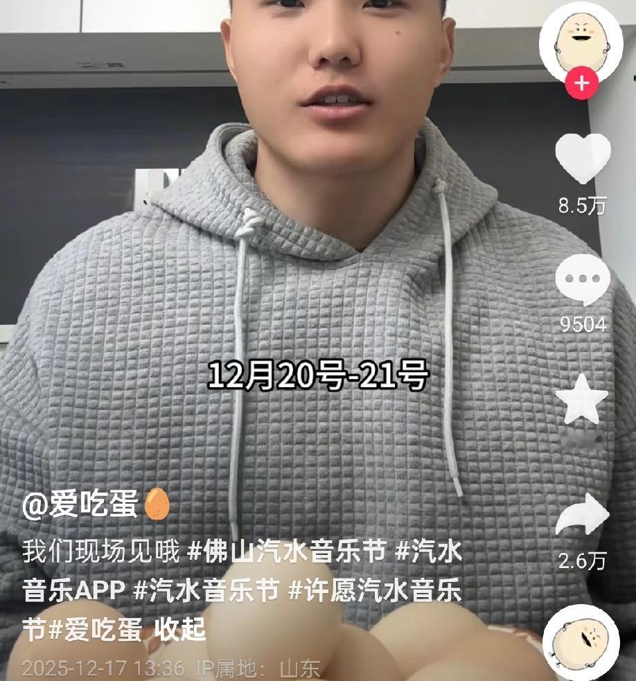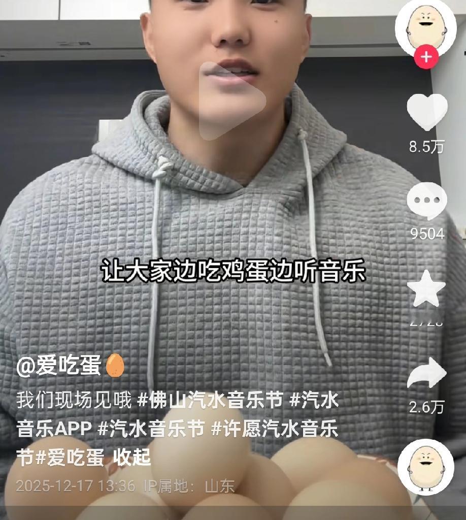 音乐节跟煮鸡蛋有啥关系?为什么会有人请爱吃蛋去参加音乐节?各个买票进去看他煮鸡蛋还是看他吃鸡蛋,那还是音乐节吗?可以把音乐节还给音乐人吗? 话说短视频的网红怎么混得这么容易,都不管管? 这世界癫得……我是越来越看不懂了! 说真的鸡蛋吃多了,不仅胆固醇高,放屁还特臭!再说一边吃鸡蛋一边蹦迪,很容易噎。