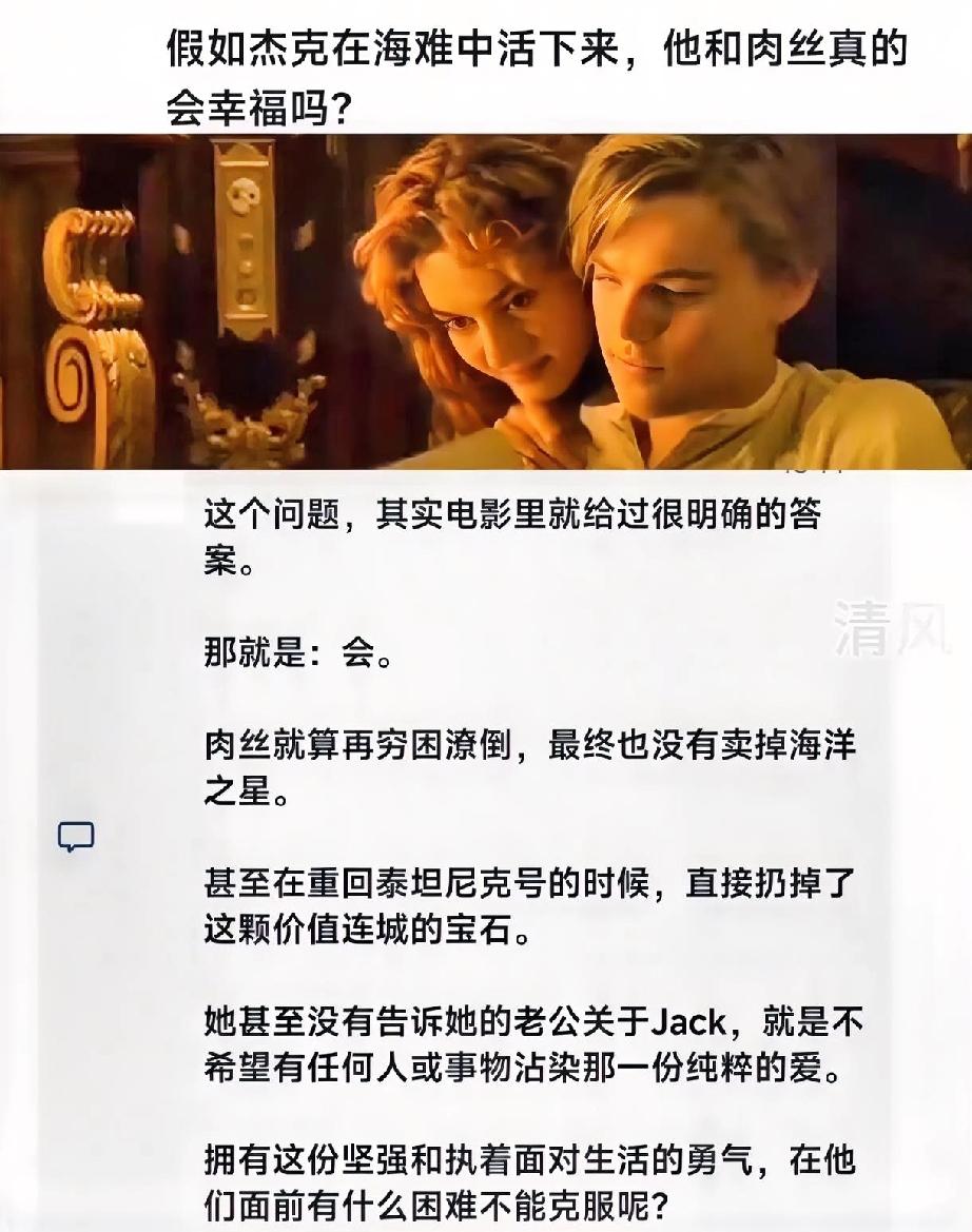她的物质生活全靠她丈夫撑着,要是杰克没死,他俩在一起,菜米油盐就得把那些爱情消磨殆尽…况且,一个泡有夫之妇的和一个出轨的,你指望这种人有多高尚的人品?最基本的夫妻之间的忠诚都做不到… 而且保险公司已经赔付过海洋之心的保费了,如果肉丝拿去卖,就是骗保,保险公司能让肉丝把牢底坐穿。 跟一个穷小子快活几天就会后悔,因为付不起房租,被赶到大街上,要不就去回归妈妈那里,凭着落魄贵族的身份,再嫁一个破落户(名声毁了),要不,就去站街了。