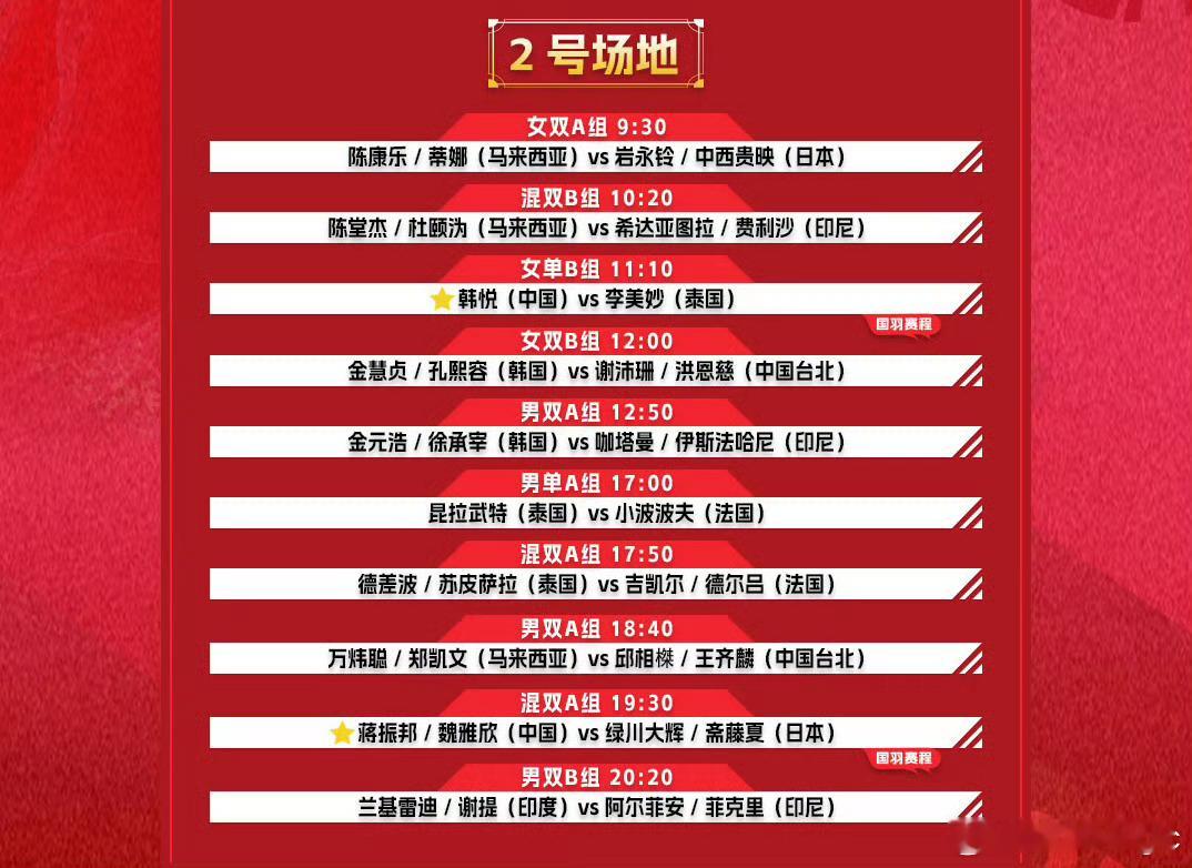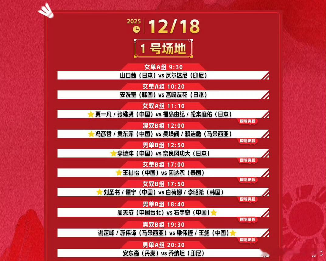 🏸2025世界羽联总决赛第二比赛日一键收藏国羽小组赛第二轮赛程一号场地第3场 贾一凡张殊贤vs福岛由纪松本麻佑第4场 冯彦哲黄东萍vs吴埙阀赖洁敏第5场 李诗沣vs奈良冈功大第6场 王祉怡vs因达农第7场 刘圣书谭宁vs白荷娜李绍希第8场 石宇奇vs周天成第9场 梁伟铿王昶vs谢定峰苏伟译二号场地第3场 韩悦vs李美妙第9场 蒋振邦魏雅欣vs绿川大辉斋藤夏