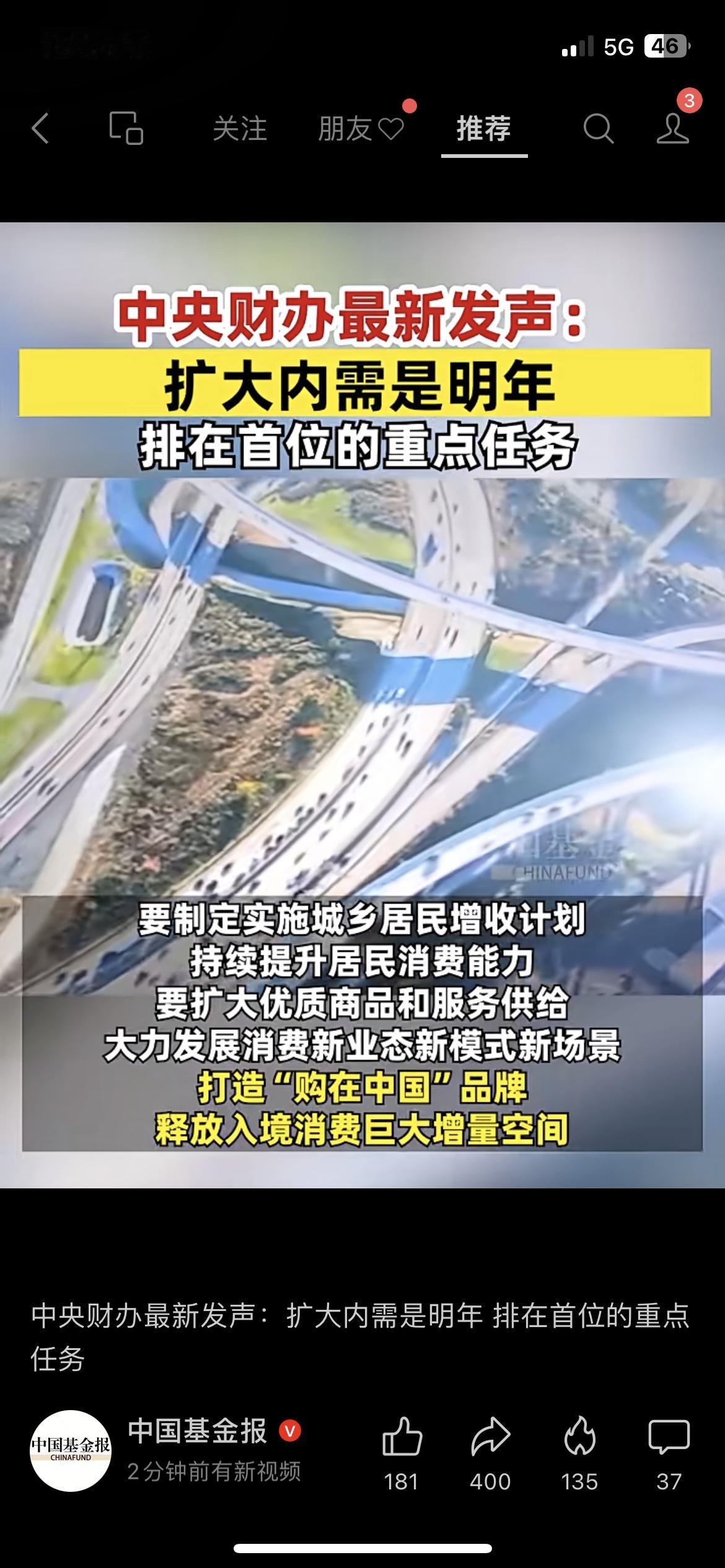 中央财办12月16日明确说了,明年要把扩大内需放在首位来抓! 具体要干的事也很