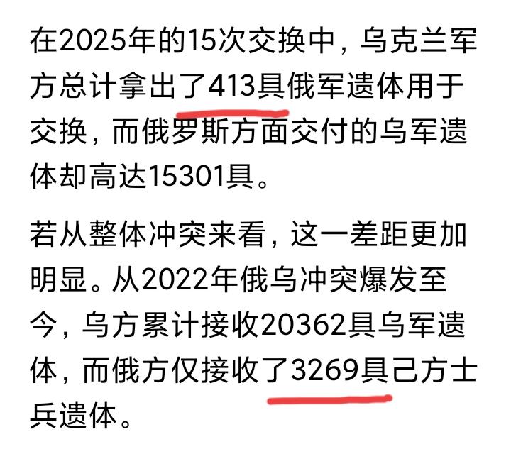 一个总统,天天说大话,满嘴跑火车, 乌克兰总统泽连斯基说,俄罗斯三年来每月阵亡30000人,是阵亡,不是伤亡, 按照泽连斯基的说法,俄罗斯46个月来已经死了138万人, 但是乌克兰近四年来,一共交给俄罗斯俄军尸体3200多具, 那么另外137万具尸体在哪里?变成蝴蝶飞走了吗?