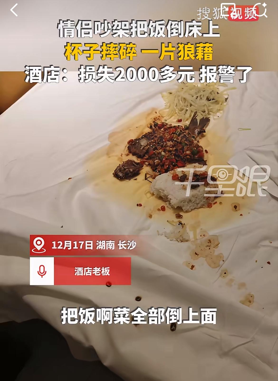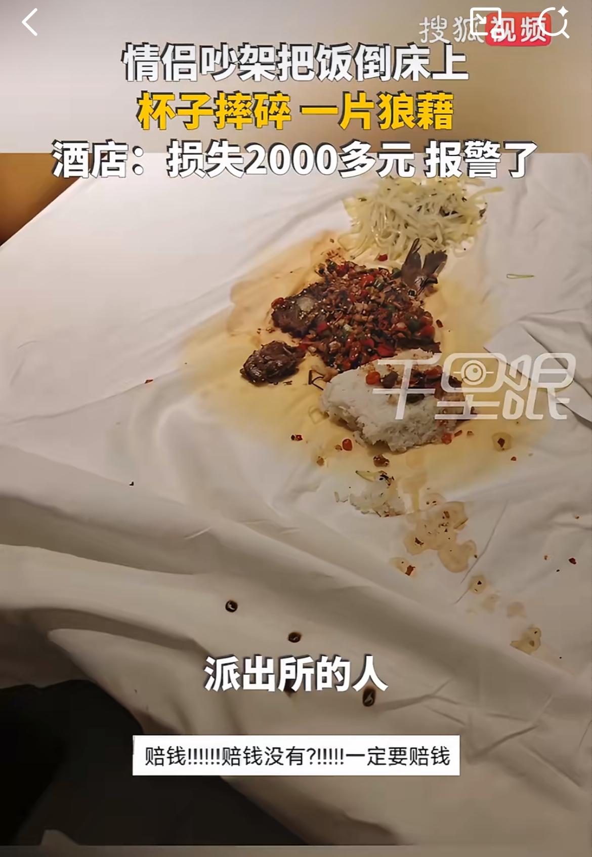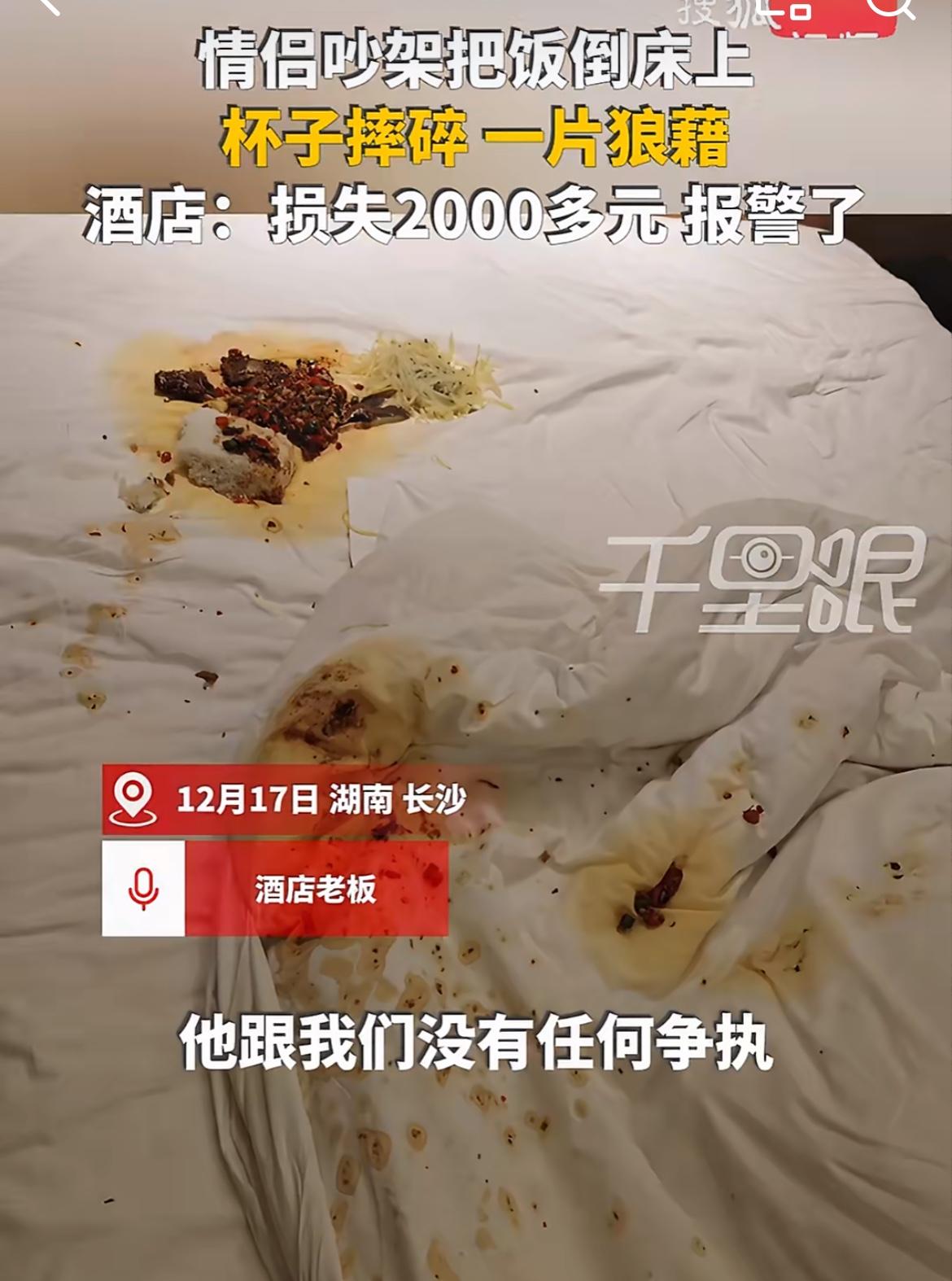 长沙情侣酒店吵架,饭菜全部倒在床上,客房一片狼藉,知道闯祸房都没退直接跑路,酒店说损失2000多块,现在酒店喊话叫他们回来赔偿损失。这个完全可以报警处理了,留了身份信息,跑得了和尚跑不了庙。这个素质实在差,吵架归吵架,把人家酒店客房弄成这样,实在太丢人,逃避责任无耻。酒店遭糟心事 长沙情感纠纷