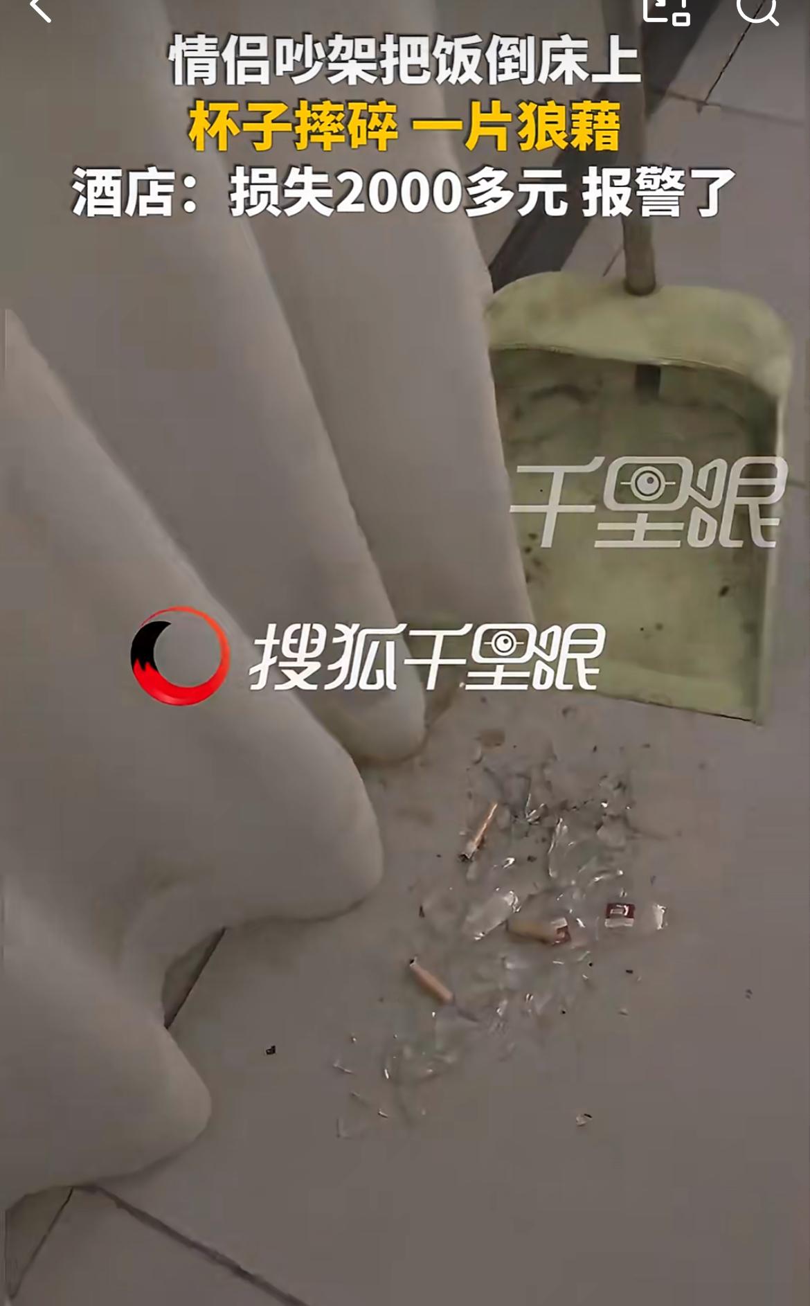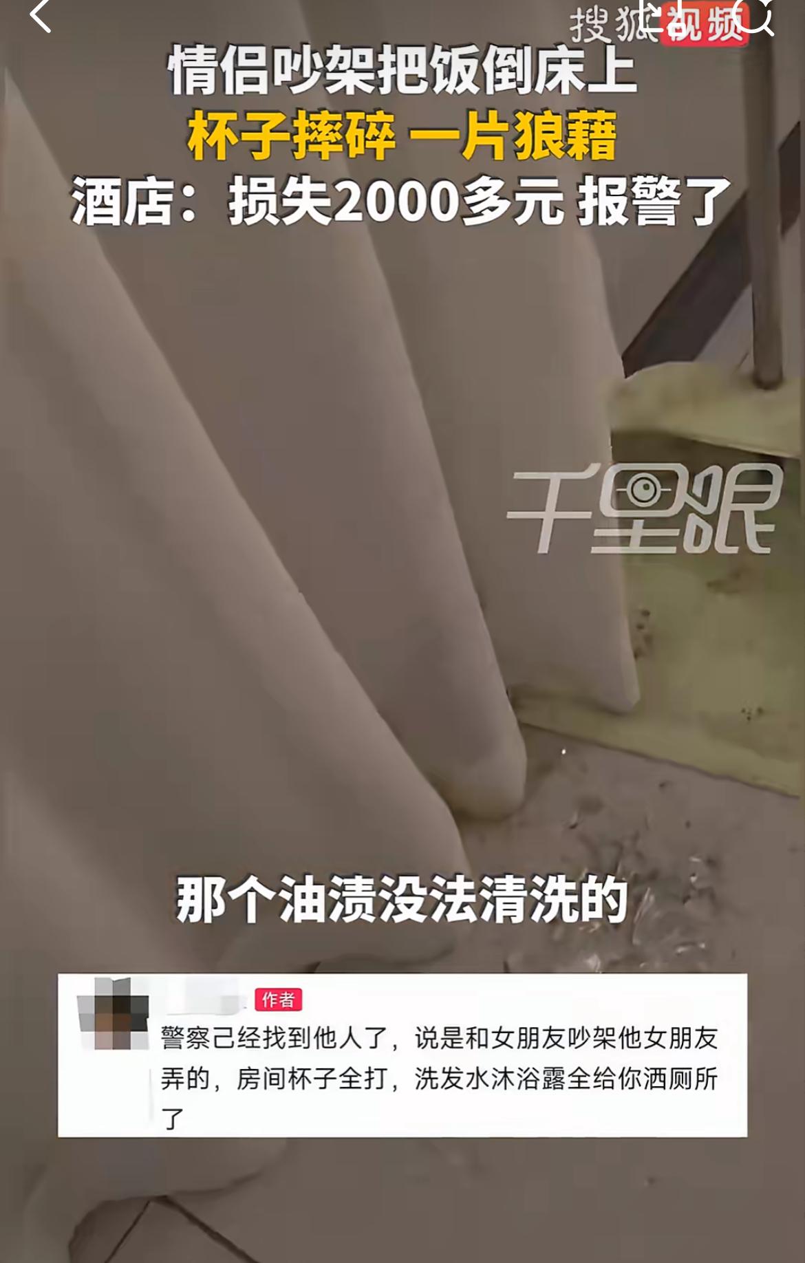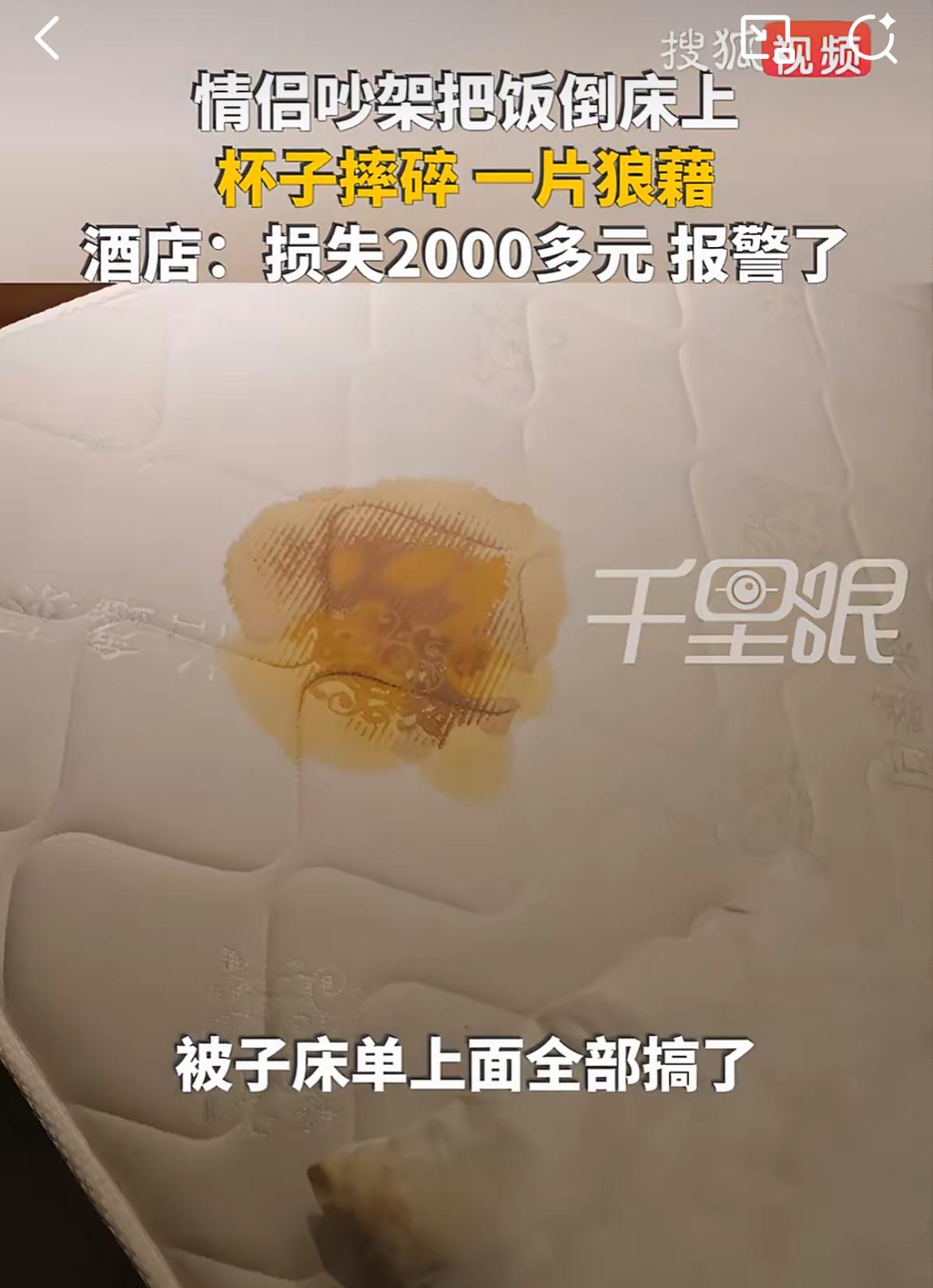 长沙情侣酒店吵架,饭菜全部倒在床上,客房一片狼藉,知道闯祸房都没退直接跑路,酒店说损失2000多块,现在酒店喊话叫他们回来赔偿损失。这个完全可以报警处理了,留了身份信息,跑得了和尚跑不了庙。这个素质实在差,吵架归吵架,把人家酒店客房弄成这样,实在太丢人,逃避责任无耻。酒店遭糟心事 长沙情感纠纷