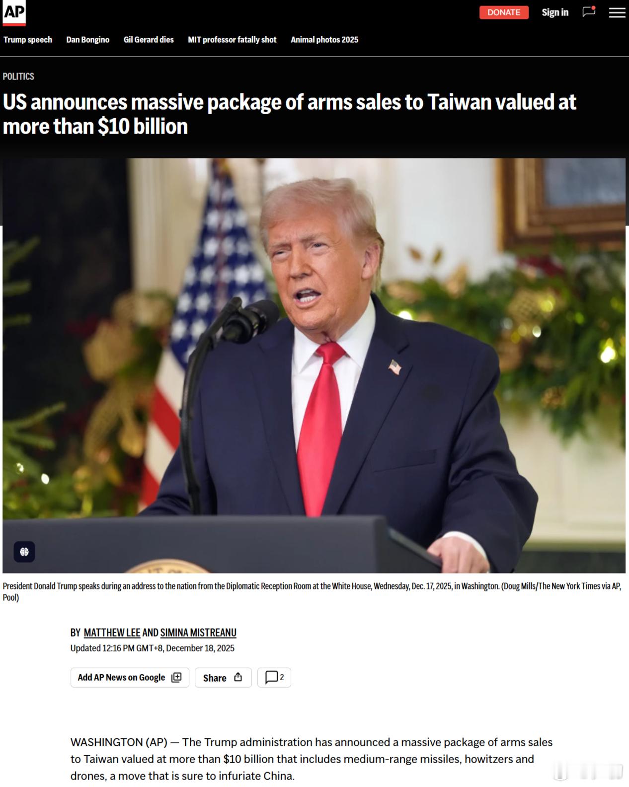 美联社:美国宣布向囼湾进行一笔价值超过100亿美元的大规模军售,包括中程导弹、榴弹炮和无人机,此举必将激怒中国。放心,我们没那么容易被激怒。我们必然、必定、必会、必必必必......