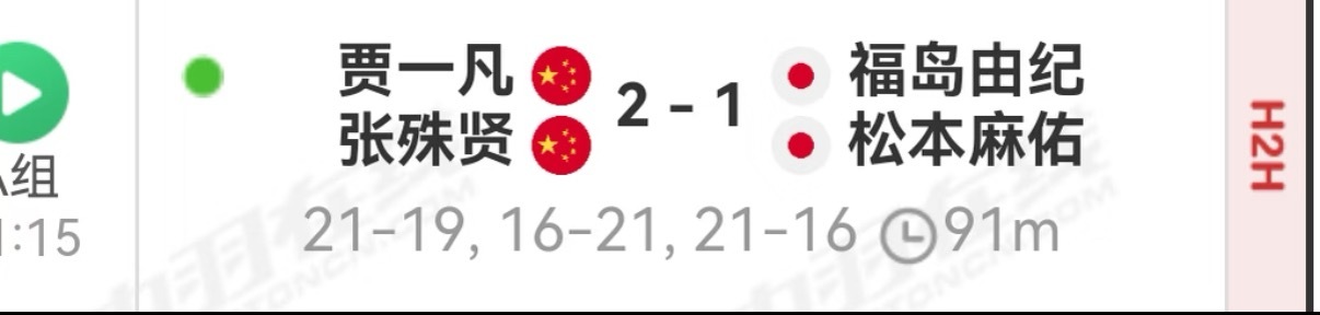 凡贤组合鏖战三局91分钟2比1战胜福松组合,为小组出线取得一线生机!贾一凡/张殊贤21-19、16-21、21-16 福岛由纪/松本麻佑。贾一凡张殊贤2比1福岛由纪松本麻佑凡贤组合获总决赛首胜