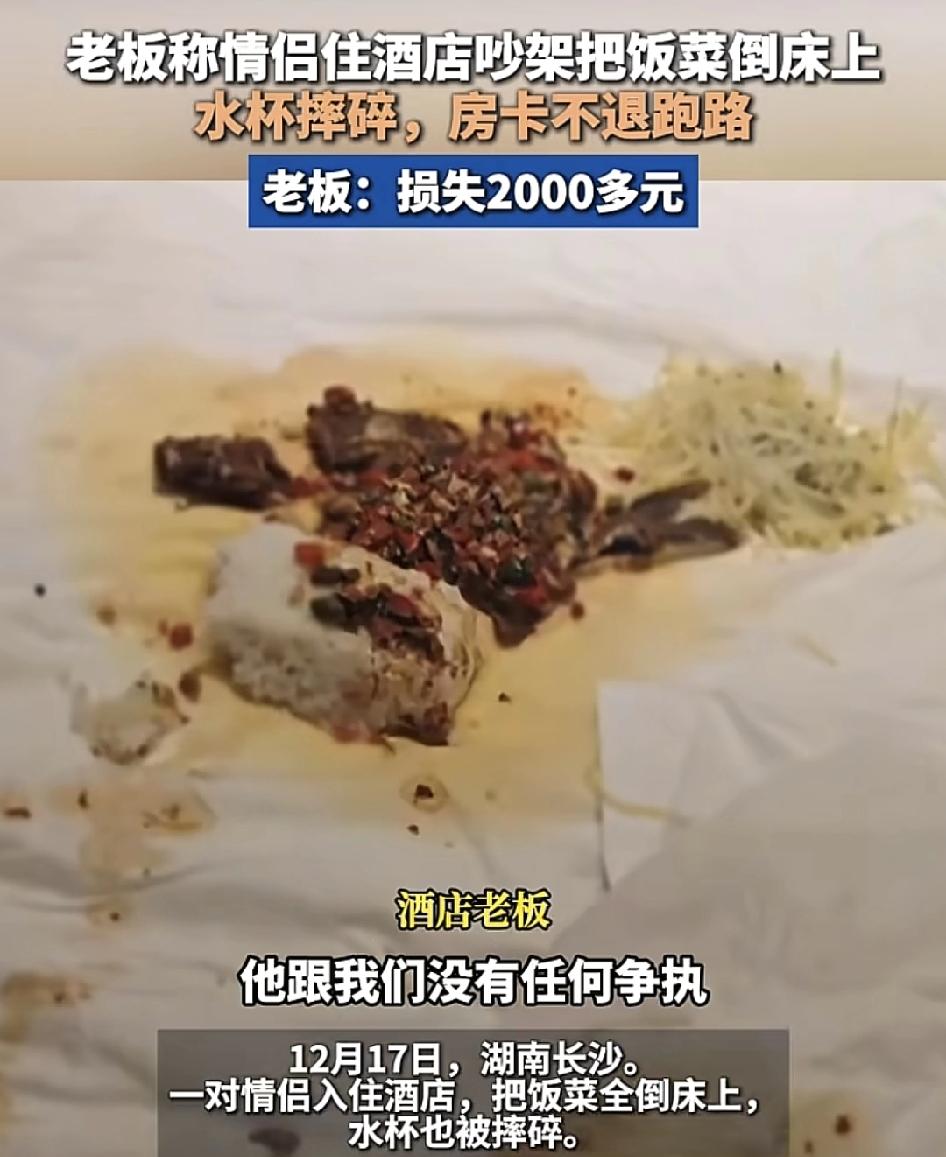 湖南长沙一对情侣入住酒店,因为发生争吵然后他们离开时把饭菜全部倒在了床上,保洁人员发现的时候被子和床单都不能用了,而且还把沐浴露全部倒进浴室里,老板称损失2000多元,报警之后让警方联系对方,当时是男的接电话,说他们发生争吵了,应该是女方做的,他完全不知情,逃跑的时候也没有退房,房卡都拿走了。