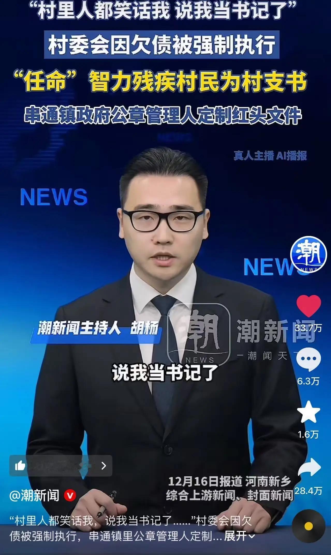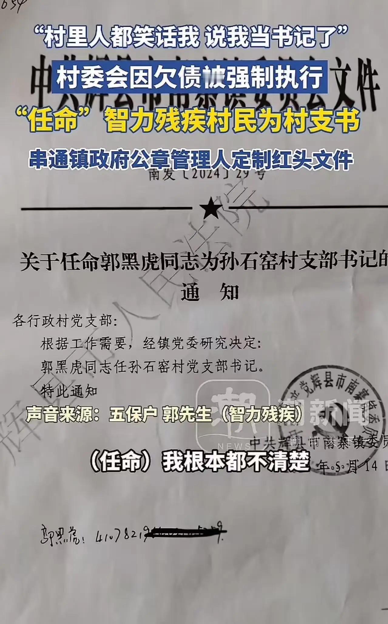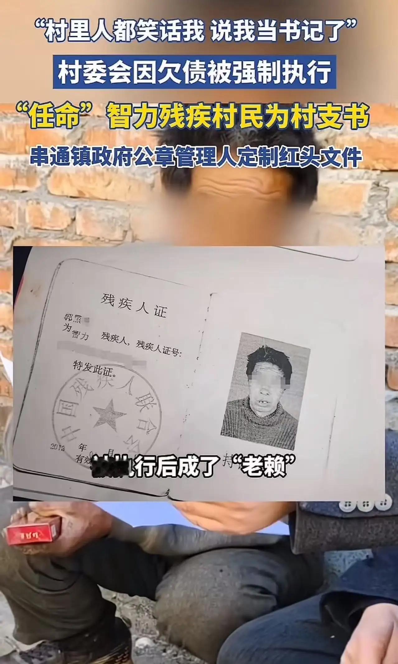 令人瞠目结舌!河南新乡辉县,村委会因欠债被法院强制执行,为逃避责任,“认命”智力残疾的村民当村支书顶包,而镇政府公章管理人还配合出了一份红头文件,把智力残疾的五保户都气的逻辑清晰了! 这则消息令人震惊且愤怒!河南新乡辉县的村委会因欠债被法院强制执行,竟然采取如此荒唐且令人发指的“应对”方式:让一位智力残疾的村民顶替担任村支书,以逃避责任。这种行为不仅严重违背法律和道德底线,也暴露出基层治理的严重乱象。 更令人愤慨的是,镇政府的公章管理人员竟然配合出具了一份“红头文件”,将智力残疾的五保户作为“责任人”进行“认命”,这不仅是对法律的蔑视,更是对弱势群体的极大不尊重和伤害。这种“以假充真”的操作,不仅使得责任推卸变得荒诞,也让公众对基层治理的公正性和合法性产生了深刻的质疑。 这种事件反映出几个严重的问题: 基层治理的腐败与不作为:一些基层干部为了逃避债务或责任,采取极端手段,甚至利用残疾人作为“挡箭牌”,严重损害了政府的公信力。 制度执行的缺失与漏洞:公章管理的松散和制度不严,使得违法操作成为可能,亟需加强制度建设和监管。 对弱势群体的歧视与剥削:利用残疾人和五保户的弱势地位进行“顶包”,体现出对弱势群体的极端漠视和剥削,令人发指。 法律意识的淡漠:如此明显的违法行为,说明部分基层单位法律意识淡薄,亟需加强法治宣传和培训。 这起事件不仅令人愤怒,更应引起有关部门的高度重视。必须彻查事件真相,依法追责,严惩违法行为。同时,要加强基层治理体系建设,完善制度流程,杜绝此类“借残疾人顶包”的丑闻再次发生。 公众也应关注和监督基层治理,维护法律尊严和社会正义。只有这样,才能真正实现基层治理的公正透明,让每一个弱势群体都能得到应有的尊重和保护。