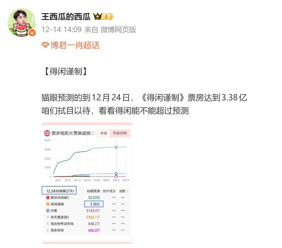 博君一肖 还记得我14号发的那条微博,当时猫眼的预测是到12月24日得闲票房达到2.38 亿元结果截止今天12月18日12:58,票房已经达到了 3.28亿元这每一个时间数字,每一个票房数字,不是3就是8的,都让我看的如此的舒服!