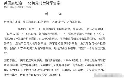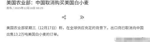 事情严重了!中国取消美国的订单!若美国没有意识到事态的严重性,弄不好我们会有更大动作!12月18日,根据外媒报道,中美关系刚趋于稳定之后,美国又在台湾问题上做文章了。外媒称,美国将启动逾111亿美元对台军售案。这一军售案销售的军品包括M109A7自走炮、海马士远程精准打击系统续购、拖式导弹续购、反装甲型无人机导弹系统、海军标枪反甲导弹续购、鱼叉导弹等等。 美国的这一操作,显然是踩在了中国的红线之上,台湾问题从来都是中国的内政,任何外部势力的干涉都是不可接受的,如此大规模的军售行为,无疑是对中国核心利益的严重挑衅,必然会对中美关系造成剧烈冲击。 就在外界还在评估这份军售案的影响时,美国农业部那边传来的消息,让整个事件的关联性变得愈发清晰。美国农业部透露,中国采购商在时隔一年多首次采购美国小麦后,突然宣布取消了一笔13.2万吨美国白小麦的订单。 这两个消息在时间上的高度重合,很难让人相信其中没有关联,毕竟农业贸易一直是中美经贸关系中重要的组成部分,中国的采购决策从来都和两国整体关系的走向紧密挂钩。 要知道,中美同为全球最重要的农业生产和消费大国,双方在农业领域的合作原本具备很强的互补性,中国市场曾经长期是美国农产品的重要出口目的地,美国农民也因此获得了丰厚的收益。 驻美国大使谢锋此前在演讲中就提到,2023年美对华农产品出口达291亿美元,占比近五分之一,平均每个美国农民对华出口近9000美元,这样的合作规模足以说明双方农业合作的互利共赢本质。 但这种互利共赢的基础,始终建立在相互尊重的前提之上,一旦美国在涉及中国核心利益的问题上肆意妄为,打破这种平衡,农业领域的合作自然会受到直接影响。 中国采购商取消这笔小麦订单,背后传递的信号其实非常明确,那就是中国绝不会容忍美国一边在经贸领域享受合作红利,一边又在核心利益问题上不断挑衅。 美国显然清楚中国市场对其农产品出口的重要性,此前中国停购美国大豆就曾让美国农业领域遭受重创,密西西比河沿岸的货运码头一度空空荡荡,北达科他州70%的大豆仓库爆满,不少农户只能将大豆露天堆放,甚至引发了农业信贷风险。 如今中国在小麦采购上的动作,无疑是在提醒美国,中国有足够的能力和底气,在经贸领域采取反制措施,维护自身的核心利益。 从实际影响来看,这笔13.2万吨的白小麦订单,对美国相关农户和农业企业来说绝非小数目,尤其是在当前全球粮食市场竞争激烈的背景下,失去中国这个大客户,美国小麦的销售必然会面临更大的压力。 而对中国而言,取消订单并不会影响自身的粮食安全,中国早已构建起多元化的农产品进口渠道,同时国内粮食产量稳步提升,完全有能力保障市场供应。 更重要的是,这个动作形成了一种清晰的威慑,它告诉美国,任何损害中国核心利益的行为都必将付出代价,中美关系的稳定发展需要双方共同维护,单方面的挑衅只会让合作的基础不断崩塌。 美国如果不能清醒认识到事态的严重性,继续在台湾问题上胡作非为,那么后续很可能会面临更多领域的反制措施,届时受损的将不仅仅是农业领域的合作,整个中美经贸关系都可能陷入更加紧张的境地。 中国始终珍视中美关系的稳定发展,也愿意在相互尊重、平等互利的基础上推进各领域合作,但这并不意味着中国会在核心利益问题上妥协退让。 取消小麦订单,只是一个明确的信号,后续的发展走向,完全取决于美国的态度和行动。如果美国能够及时收手,停止在台湾问题上的挑衅行为,回到中美三个联合公报的正确轨道上来,双方还有可能重建合作互信。 要是美国依然我行我素,无视中国的警告,那么等待它的必将是更加强有力的反制,中美关系也将因此面临更大的不确定性,而这一切的后果,都需要美国自己来承担。 毕竟,中国维护国家主权和领土完整的决心坚定不移,任何试图挑战中国底线的行为,最终都只会搬起石头砸自己的脚。