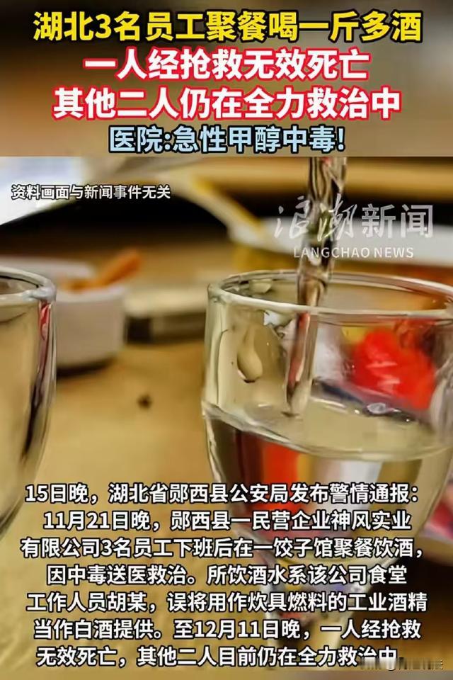 湖北十堰,五名男子从公司食堂打包了一斤多白酒,下班后带到公司外的饺子馆聚餐,饭后,3名饮酒者中一人中毒死亡,一人脑死亡,一人仍在抢救。这一切的起因,竟然是食堂员工粗心大意将工业酒精当白酒给了他们! 据红星新闻、温州都市报等报道,11月21日晚,郧西县某公司加工车间员工李某某等5人下班后,决定一块去公司外面的饺子馆喝几杯聚个餐。 该公司将食堂外包给了别人,因为车间里有些工作比较累,所以很多人都喜欢在下班后喝一杯解解乏,因此,食堂里提供有白酒。 案发当天,李某某等5人临走前,有人去食堂要了点白酒,食堂员工胡某给他们的瓶子里装了一斤多。 随后,5人来到饺子馆吃饭,聚餐期间,李某某等三人喝了酒,其余两人没喝。 实际上,酒刚一入口,李某某等人就觉得有点不对味,但是并没有多想,三人就这样喝了起来。 吃完饭后,喝酒的三个人都觉得有点不舒服,但都以为是不适应这个酒,并没有多想。 11月22日下午,其中一人去 县医 院 就 诊,23日,另外两人也撑不住了。可三人情况并没有好转,于是三人转到市 医 院。 转院当天,经过检测,三人为急性重 度 甲 醇 中 毒。 11月25日,经检测,李某某血液甲醇含量为41.33mmol/L,而实际上,这个正常参考区间应该小于0.0156mmol/L。 截止到12月14日,李某某已经脑死亡,另外两人一人已经死 亡,一人仍在抢救。 事后,经过调查,案发当天他们从食堂拿的酒,实际上并非白酒,而是食堂用来做燃料的工业酒精。 据食堂承包者称,在工作过程中,他们会用工业酒精当做炊具燃料用。案发当天,胡某一粗心,误将工业酒精当做散装白酒,灌进了李某某等人的瓶子里。 工业酒精的主要成分虽然是乙醇,但是在生产过程中会混有甲醇,而甲醇是有毒的。 李某某等三人就这样稀里糊涂,将工业酒精喝到了肚子里。 1、这起惨案应该由谁承担责任? 《民法典》第一千一百六十五条规定,行为人因过错侵害他人民事权益造成损害的,应当承担侵权责任。 员工胡某误将工业酒精当作白酒给员工,存在明显的过错。 食堂外包方对其员工有管理和监督的义务,员工的这一失误导致了严重的损害后果,外包方应承担侵权责任。 承包者需要对三名员工的人身损害承担赔偿责任,包括医疗费、误工费、护理费、死 亡赔偿金等。 另外,虽然公司将食堂外包,但公司对员工的安全保障负有一定责任。 《民法典》第一千一百九十八条规定,宾馆、商场、银行、车站、机场、体育场馆、娱乐场所等经营场所、公共场所的经营者、管理者或者群众性活动的组织者,未尽到安全保障义务,造成他人损害的,应当承担侵权责任。 公司允许食堂在工作场所提供白酒,就有义务确保所提供酒水的安全性。 公司在管理上存在一定的疏漏,没有对食堂的酒水供应进行有效的监督和管理,所以公司也需要承担相应的补充责任。 案发后,公司已垫付了40多万费用,可视为其在一定程度上履行了部分责任,但后续仍需根据最终的责任划分承担相应份额。 2、本案是否构成刑事案件? 《刑法》第一百四十四条规定,生产、销售有毒、有害食品罪是指在生产、销售的食品中掺入有毒、有害的非食品原料的,或者销售明知掺有有毒、有害的非食品原料的食品的行为。 据承包者称,本案是因店员误将工业酒精当做白酒给了李某某等人,但本案仍在调查中,具体情况仍旧没有定论。 如果食堂将工业酒精进行勾兑,当做白酒提供给他人饮用。 那么,即使他们主观上没有直接致人死 亡的故意,但该行为已经符合生产、销售有毒、有害食品的行为特征,且造成他人死 亡的严重后果。 这种情况下,可以以生产、销售有毒、有害食品罪追究相关人员的刑事责任。 如果事实如承包者所说,本案发生是因胡某误将工业酒精当成白酒,那本案就不构成生产、销售有毒、有害食品罪了。 如果经调查发现,食堂存在长期管理混乱、对工业酒精和白酒的存放和使用没有严格规范等情况,可能会构成重大责任事故罪。 《刑法》第一百三十四条规定,该罪是指在生产、作业中违反有关安全管理的规定,因而发生重大伤 亡事故或者造成其他严重后果的行为。 若食堂的管理问题导致了此次事故的发生,相关责任人可能会被追究重大责任事故罪。 另外,湖南蓝山县曾有案例,工作人员误将甲醇当作米酒给客人饮用,导致多人死 亡,相关责任人被认定构成过失致人死 亡罪。 如果食堂因疏忽大意或过于自信,未能将工业酒精和白酒进行妥善保存和区分,最终导致员工误将工业酒精当作白酒给了李某某等人,还可能构成过失致人死 亡罪。 目前,为李某某等人提供白酒的胡某已经被采取刑事强制措施,案件仍在调查中。