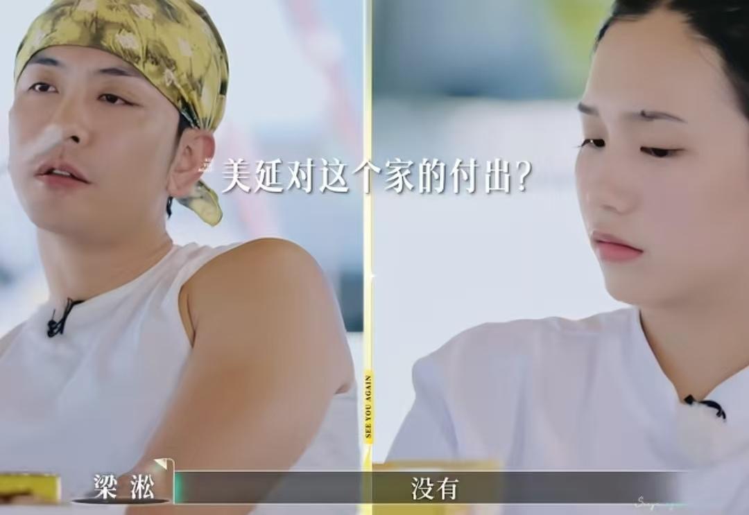 梁淞说何美延对家庭没有付出,何美延让他不要对自己挑刺! 梁淞:“其实大多数都是老妈在做”,何美延:“你不能这样子,就是把人家的付出全部都抹灭掉”,梁淞:“你都会把鼻涕纸扔在枕头上的人,你做什么卫生呢”,何美延:“你除了鼻涕纸,你还能指的出什么” 梁淞是一点都不觉得何美延对家庭有付出,何美延在家里也会洗衣服做家务 徐志胜和李雪琴一直在旁边帮梁淞找补,但是最后梁淞直接说没有付出