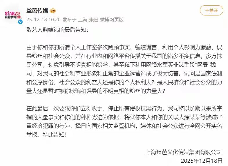 鞠婧祎和丝芭这出大戏真是越来越“刑”了!公司直接甩出“最后告知”,称要实名举报她“涉嫌严重经济犯罪”,这词儿一出,看得人一愣。 一边说合约早到期了,签名是伪造的,公司还搞“阴阳合同”坑钱;另一边则晒出鉴定报告,说给了1.6亿规划发展,支付了1.39亿,月月还有25万固定收入,配房配车配司机。这哪是解约纠纷,简直是“公说公有理,婆说婆有理”的顶级商战连续剧。 如今战火升级到“经济犯罪”层面,看来是真要撕破脸对簿公堂了。坐等一个后续“实锤”,看看到底是合约陷阱,还是另有隐情。这瓜,保熟吗?