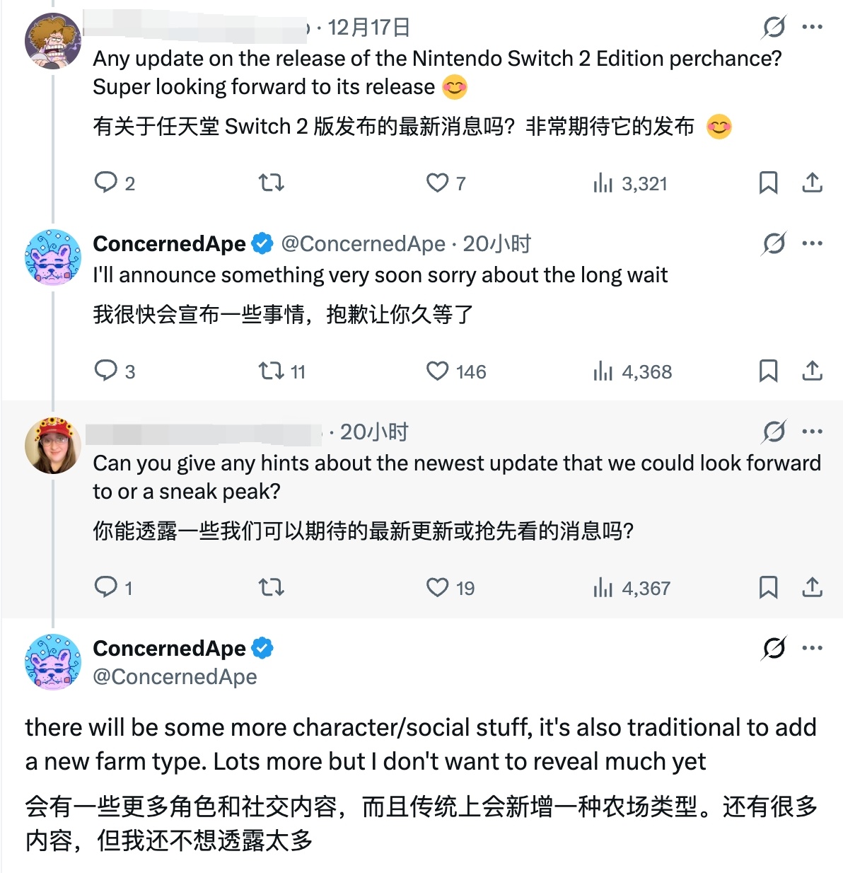 【《星露谷物语》1.7版本细节曝光,Switch 2版新情报将至】《星露谷物语》制作人ConcernedApe在社交媒体上稍稍透露了1.7版本的游戏内容。在回应粉丝的提问中表示1.7版本:“将会加入一些角色/社交方面的内容,按照惯例还会新增一个农场类型。此外还有很多内容,但现在不想透露太多。”ConcernedApe表示会“很快”宣布有关《星露谷物语》Switch 2的一些事情。目前已知游戏将免费提供升级,并支持鼠标控制,但尚未公布具体的发布日期。星露谷物语