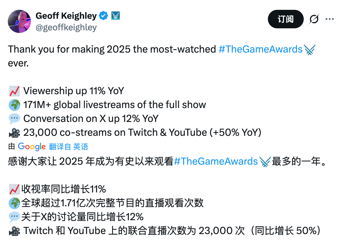 【TGA 2025全球观看量创新纪录,争议越大关注越高?】上周举行的TGA颁奖典礼的全球直播观看次数超1.71亿次(完整节目),创下了新的历史记录,相较去年1.54亿观众增长了11%。YouTube和Twitch平台的收视率均有所上升,奖项投票也提高了10%。值得一提的是,TGA在国内平台的播放量也创下历史新高。TGA近几年争议不断,包括但不限于奖项归属、宣传片时间远大于颁奖时间、评选权威性等,本届TGA的口碑调查中,D及以下的评价更是占到了近39%,但不可否认的是,TGA的影响力和关注度却是实实在在的逐年增长。TGA 主持人Geoff Keighley在社交媒体上发文感谢大家,“让2025成为有史以来观看最多TGA 最多的一年”。以下是TGA的历史观看人数:2025:1.71亿2024:1.54亿2023:1.1亿2022:1.03亿2021:8500万2020:8300万2019:4520万2018:2620万2017:1150万2016:380万2015:230万2014:190万