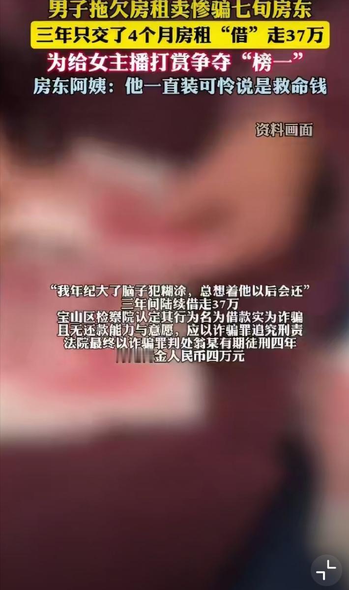 太缺德,专挑独居老年人下手!上海宝山独居老人孟阿姨,将空置房租给来自江苏连云港的租客翁某。可令孟阿姨万万没想到的是,这竟是翁某以租房为名精心设计的骗局。 孟阿姨已过7旬,在上海独居,老年生活依赖出租房兜底。来自连云港的翁某租住在孟阿姨的出租房内。翁某支付了4个月的房租后,就以家庭困难为由,长期拖欠房租。 但是拖欠房租不是他的最终目的,诈骗孟阿姨钱财才是他的终极目标。 此后3年里,翁某编造各种谎言,比如:家人生病,做患癌手术,孩子学费多种理由向孟阿姨借钱。善良的孟阿姨蒙在鼓里,同情翁某的遭遇,竟一次又一次相信了翁某的谎言,向他转账。 骗子一旦上手,就一发而不可收,胃口和胆子也越来越大,完全把翁阿姨当成了摇钱树和提款机。 之后的理由更加离谱,翁某继续在翁阿姨面前诉苦,说孩子保险费已到期,没有钱续费,家人住院,医院催缴住院费。反正他家要么这个生病,要么那个患癌,理由各异。 更可笑的是,孟阿姨转账稍慢了些,翁某便心怀不满,利用电话轰炸,迫使孟阿姨赶快转账。 有句俗语叫“吃屎的管住了屙屎的”,正是这种关系的真实写照。 翁某屡屡得手,就更加得寸进尺,时间一长,自己都认不清自己是谁了。 只要孟阿姨催他还款,他就装可怜:要么工资还未发,要么车子出了故障,要么受了伤,要么老丈人进了重症监护室,从2022年至2015年3年间,翁某以名种理由从孟阿姨处骗得金额累计达37万元! 也许你会问,翁某诈骗的理由都是借家人为幌子,那他一定是一个对家庭负责的人吧,答案恰恰相反。据翁某家属反应,其经常在外游荡,长期与家人失去联系,更别说对家庭经济上的支持和帮助了。 更荒唐的是,他长期沉迷于短视频直播平台,以打赏主播为乐。为了维持“榜一大哥”的身份,不断向平台充值打赏,在虚拟世界满足自己的虚荣心,用诈骗得来的资金中的28.4万元直接用于打赏美女主播,其余资金被他全部挥霍。 孟阿姨不但3年的房租打了水漂,还倒贴了一辈子积攒的37万积蓄,租房租了个诈骗犯。 孟阿姨最终觉醒,警方抓获翁某,检察机关以诈骗罪提起公诉,经法院审理翁某诈骗成立,以诈骗罪判处翁某有期徒刑4年,并处罚金4万元。 有网友认为判罚过轻,需提高量刑下限,以震慑犯罪。 这起案例给我们以深刻启示:当下,我们的社会已进入老年化时代,独居老人越来越多。随着年龄的增加,防范意识逐渐减弱,诈骗分子正好利用老年人的善良和薄弱点,打感情牌,精准设计针对老年人的骗局。比如以保健品冒充药品,价值几块钱卖几百块,不但没有药效,反而对健康构成威胁,把老年人当韭菜。 为防止此类案件的再次发生,除了老人自身擦亮眼睛,提高警惕外,子女的关怀首当其中,特别是独居老人,社区应将其纳入定期关怀名单,建立一套完善的风控机制,以守护独居老人的生命财产安全。