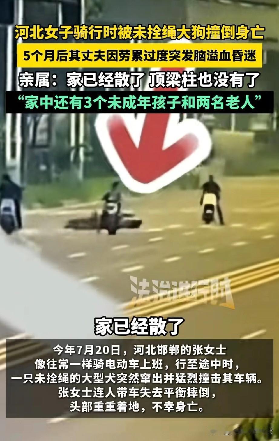 这家人真惨!今年7月份,河北女子早上骑电动车上班的途中,被突然从路边窜出来的大狗撞倒,女子连人带车摔倒在地,头着地,不幸身亡。 其实当时狗主人就在旁边,但是狗没有拴绳,他也来不及阻拦。 可怜女子才37岁,正是上有老下有小的年纪。她家里有三个未成年的孩子,大的刚15岁,最小的才7岁。 因为狗没有拴绳,主要责任在狗主人,女子家属要狗主人赔偿,狗主人却嫌家属要的太多了,他赔不起。 帽子叔叔去调查这个案子时,狗主人就已经把狗打死扔进废井了。这个事现在这个事开始由交警负责,后来说不属于交通事故。又移交到了刑警队,现在虽然已经立案了,但还没出结果。 女子去世后,她的丈夫一边安抚年迈的父母,又要照顾三个孩子。还得东奔西跑的为案子奔波。狗主人没赔,女子又是临时工,工伤认定也很麻烦。女子一天天的搞的焦头烂额。 现在女子家人说,屋漏偏逢连夜雨,女子丈夫也因为过度劳累突发脑干出血昏迷了,住进了ICU。家里唯一的顶梁柱又倒了,这个高端端家现在搞的支离破碎。 孩子的爷爷奶奶说,儿子的手术费还没着落,孩子的学费也快交不起了。 有网友说,建议养狗不栓绳直接入刑。太可气!这一家人都被一条狗给毁了。 对于这件事,你怎么看呢?