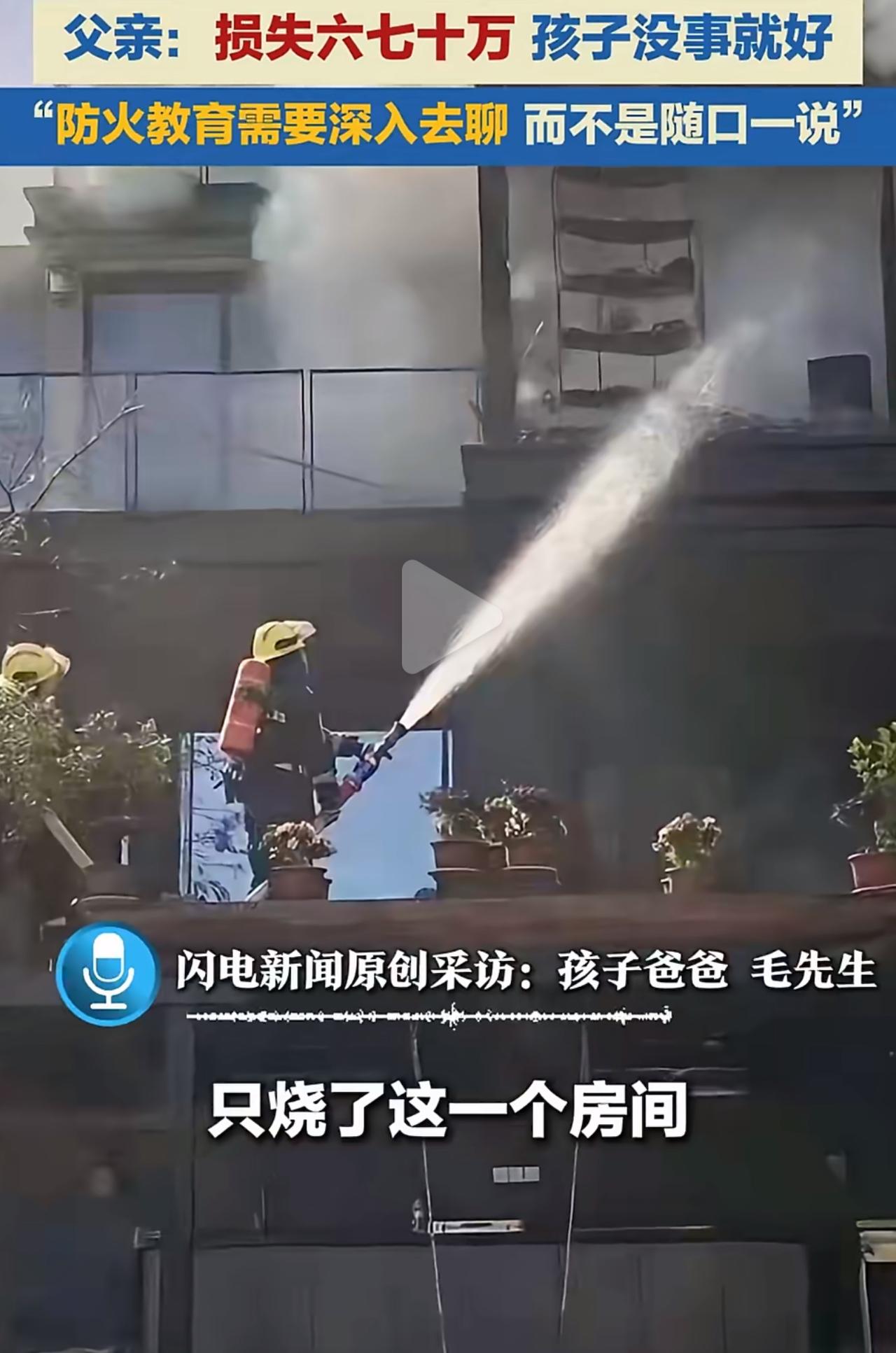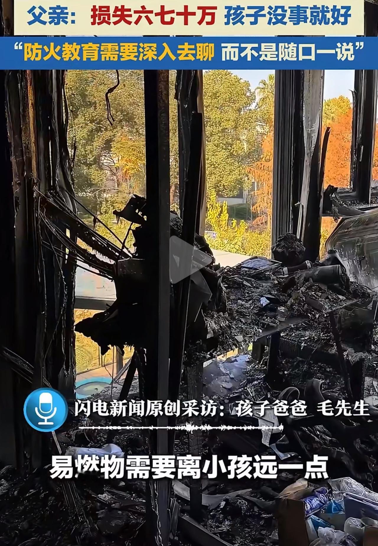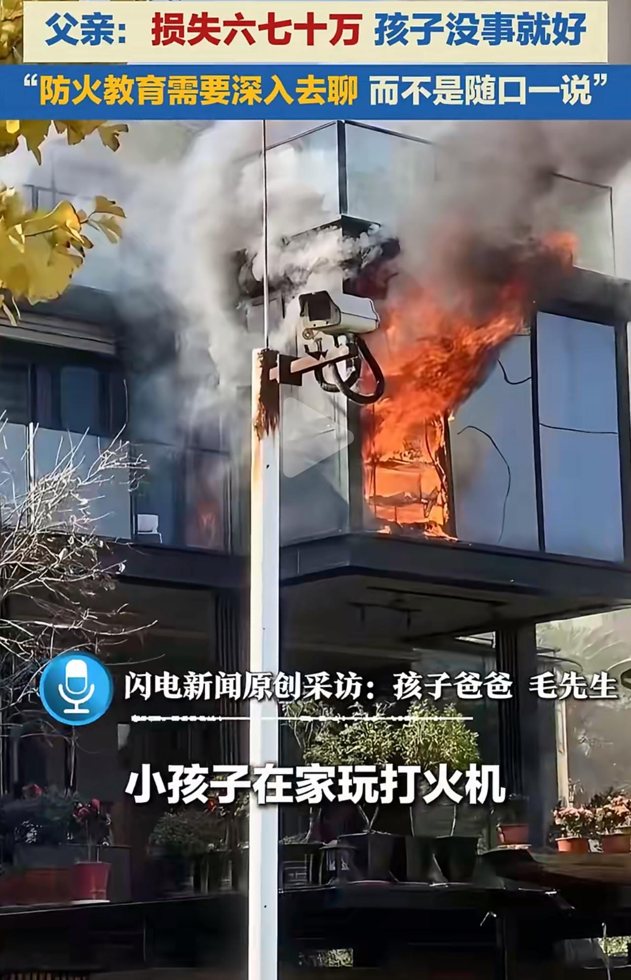谁家还没个熊孩子?武汉这户人家真的被5岁娃坑惨了!就因为好奇摸了打火机点纸巾,烫手了一甩手,火苗“噌”地就窜上窗帘,一间别墅房直接烧没了70万! 孩子当时肯定吓懵了,瞅着冒出来的火光,小手攥着烧坏的打火机直哭。爸爸赶到的时候,屋里早就乱成一锅粥了,电脑、游戏机全烧成了黑炭疙瘩,换谁看了能不心疼?可他硬是没舍得揍孩子,只憋出一句“孩子没事就好”。 这事一出来,网友直接炸开了锅。有人盯着70万的损失一个劲儿咋舌,有人却一针见血:打火机咋能让娃随便摸得着?爷爷拿坏打火机哄娃的操作,更是把家长监护的漏洞彻底暴露了。 有人说“打一顿才长记性”,也有人夸爸爸够理性。说到底,火这玩意儿哪是光说教就能拦住的?用绘本讲危害,拿小实验演火情,把打火机锁进柜子里才是实在招。多少类似的火灾就摆在眼前,别等真烧了房子,才后悔没把安全教育当回事!熊孩子 熊孩子的点滴 5岁男孩玩打火机烧了自家别墅