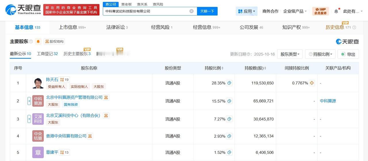 寒武纪增资至约4.22亿 天眼查工商信息显示,近日,寒武纪发生工商变更,注册资本由约4.18亿人民币增至约4.22亿人民币,同时,部分高管也发生变更。 中科寒武纪科技股份有限公司成立于2016年3月,法定代表人为陈天石,经营范围含技术进出口、货物进出口、计算机系统服务、软件开发、销售计算机软件及辅助设备等。股东信息显示,该公司由陈天石、北京中科算源资产管理有限公司、北京艾溪科技中心(有限合伙)等共同持股。 天眼查信息: