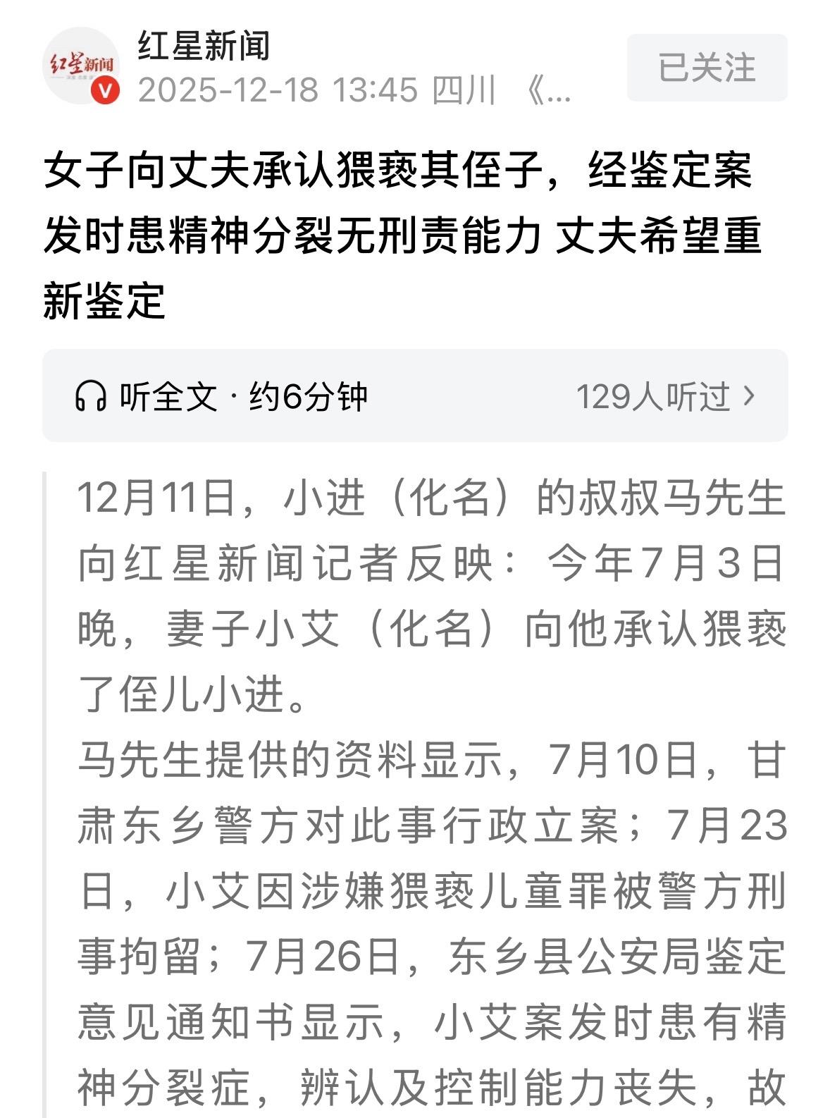 甘肃,男子发现妻子夜里不回屋睡觉,竟躺在侄子屋里,侄子则在一旁神情奇怪,他觉得氛围不对劲,就问妻子老往孩子屋跑啥?结果妻子不打自招,说前几天她对侄子做了不该做的事,男子不敢相信3个孩子的妈能做出这种事,可侄子却哭着承认了。男子当机立断要离婚,把妻子赶回娘家,并报了警,要求妻子全家赔偿,事后,妻子因涉嫌猥亵被刑拘,可没多久就放出来了,理由是,经鉴定她在事发时患有精神问题,所以不用负刑责,而接下来发生的事,更让男子和侄子父母无法接受。 晚上11点多,马先生把孩子们都哄睡着后,发现妻子迟迟没回屋睡觉,就起身去找。 家里房间都连着,他走到侄儿小进睡觉的屋子一看,发现妻子正躺在侄儿睡的床上,而12岁的侄儿小进,一个人坐在旁边的沙发上,神情不太对劲。 小进是马先生大哥老马的儿子。 老马夫妻俩长年在外地打工,小进也在外地上学。这会正赶上暑假,小进回老家看奶奶,暂住在叔叔马先生家里。 马先生见状把妻子拉回自己房间,说你去人孩子那屋干啥? 结果,妻子的回答给了他当头一棒。 妻子竟不打自招,说就在6月30号那天晚上,她对侄子小进做了不该做的事,猥亵了他。 马先生简直不敢相信自己的耳朵,这可是他3个孩子的妈!怎么能对一个孩子做出这种事? 因为那段时间他正和妻子闹离婚,关系挺紧张,他全当妻子是故意气他。 马先生心乱如麻,又去找小进确认,最后得知妻子所言属实。 事后小进因为太害怕,再加上觉得丢人,一直憋在心里不敢告诉家里大人,当叔叔问起时,他哭着承认了。 这个结果让马先生感觉天旋地转。他完全不知道怎么处理了。 第二天,他直接打电话给老丈人,让他赶紧来把女儿领走。同时,他跟老丈人说这个婚离定了,还得要他们家赔偿损失。 小艾很快就被接回了娘家。 就在这晚,小进可能觉得没法面对,竟离家出走了。马先生一家四处找了一天,才在一个小旅馆找到孩子。 事情闹成这样,马先生和老马家直接报案。 7月10号,他们收到消息,小进被猥亵案,已经正式立案了。 案子一开始是按治安案件走的,但到了7月21号,性质变了,转成了刑事案件。 2天后的7月23号中午,公安给小艾的家属送去了拘留通知书,理由是小艾涉嫌猥亵儿童罪,已经被刑事拘留了。 眼看就要追究刑责了,没想到事情又来了个大转弯。 7月26号,公安局又送来一份鉴定意见通知书。也就是这份让所有人都傻眼了。 上面写着:经过专家鉴定,小艾在案发时,患有精神分裂症,而且她在干那事的时候,脑子不清醒,完全不知道自己干了啥,也控制不了自己。 根据《刑法》第18条第1款规定:精神病人在不能辨认或者不能控制自己行为的时候造成危害结果,经法定程序鉴定确认的,不负刑事责任,但是应当责令他的家属或者监护人严加看管和医疗。 小艾被鉴定为案发时患精神分裂症且辨认及控制能力丧失,无刑事责任能力,所以法律上认为她不用负刑事责任。 虽不追究刑事责任,但需由家属严加看管或强制医疗。 很快,小艾被从看守所转送到了医院接受治疗。 既然不用负刑责,但又担心她精神不稳定会再出事,按照法律规定,可以申请对她强制医疗。 10月29号,检察院就向法院提交了申请,要求对小艾进行强制医疗。 然而,法院并没有同意检察院的申请,直接驳回。 为啥驳回呢?法院给的理由是:小艾被送去医院治疗后,病情稳定下来了,治疗效果也挺明显。 更重要的是,小艾自己和她的家人都不同意对她强制医疗。根据现有的证据,没法证明小艾以后还会有危害社会的危险。 所以,法院决定不强制医疗了,让小艾的监护人把她带回去,但必须对她严加看管和治疗。 对于这个结果,还有之前的精神病鉴定,小艾的丈夫马先生和大哥老马,心里都打满了问号,根本无法接受。 马先生非常肯定地说,我俩结婚7年了,3个孩子都生了,我从来没发现她有啥精神问题! 另一边,老马更是忧心忡忡,儿子小进受到的伤害太深了。 孩子以前挺开朗爱说话的,现在变得沉默寡言,明显是心理受到了巨大创伤。 老马认为,这事不能就这么算了。他坚决要求重新给小艾做精神鉴定。 但是,当检察院要求侦查机关重新鉴定时,遇到了阻力。小艾那边不配合,所以重新鉴定一直没能做成。 老马没办法,只好通过检察网的平台反映了这个情况。11月27号,检察院回复了他,证实了重新鉴定因小艾不配合而搁浅。 法院驳回强制医疗的决定出来后,马先生和老马两兄弟都没放弃。12月11号,兄弟俩都表示,他们已经向上级法院提交了申请,请求对这个案子进行复议。 他们最大的愿望就是:能重新给小艾做一次精神鉴定到底是不是真有病,并且追究她的刑事责任。 他们觉得,不能因为一份鉴定就抹掉了小进受到的巨大伤害。 对此,你怎么看? 关注@运良说法. 学法律知识不迷路