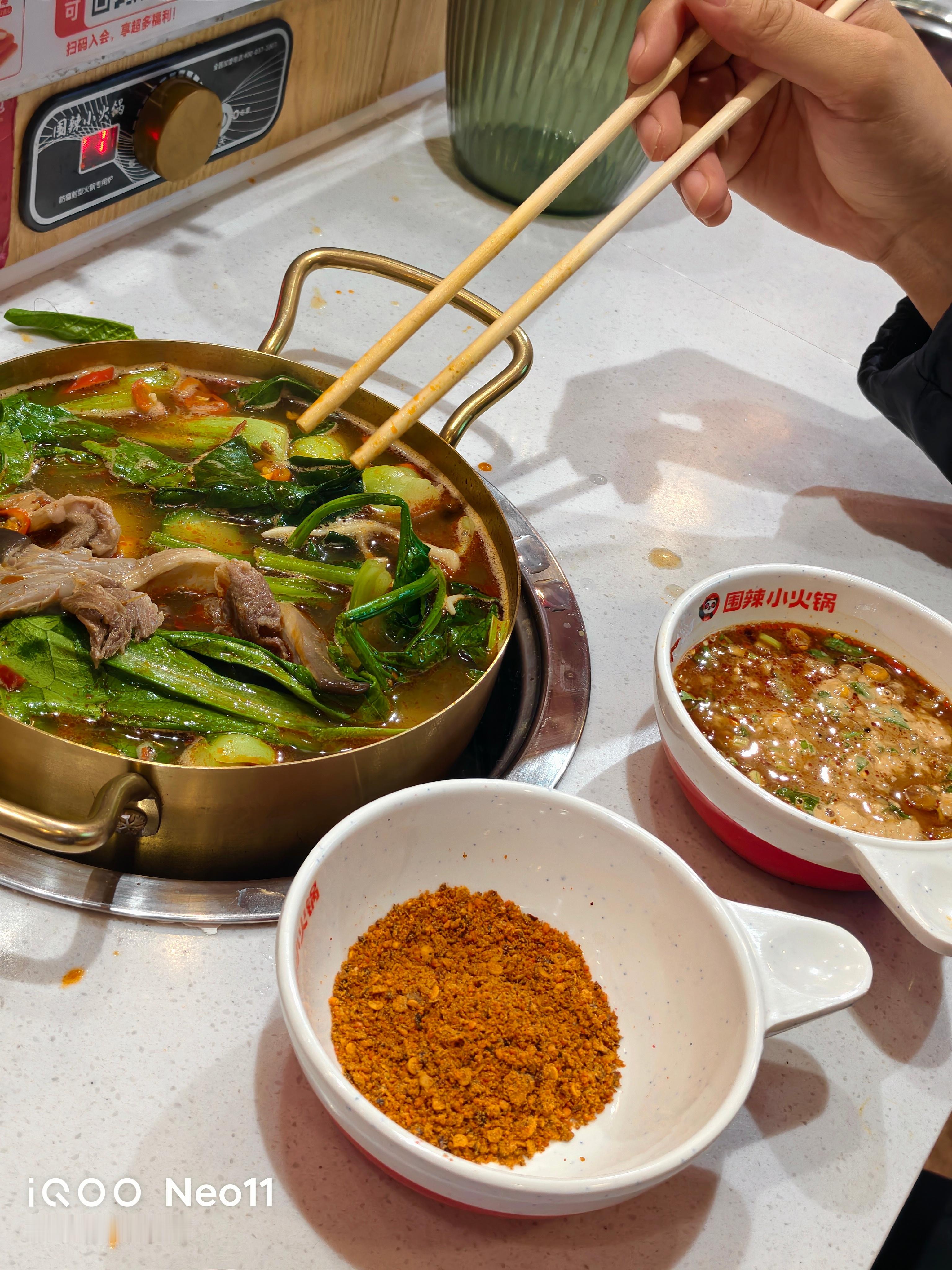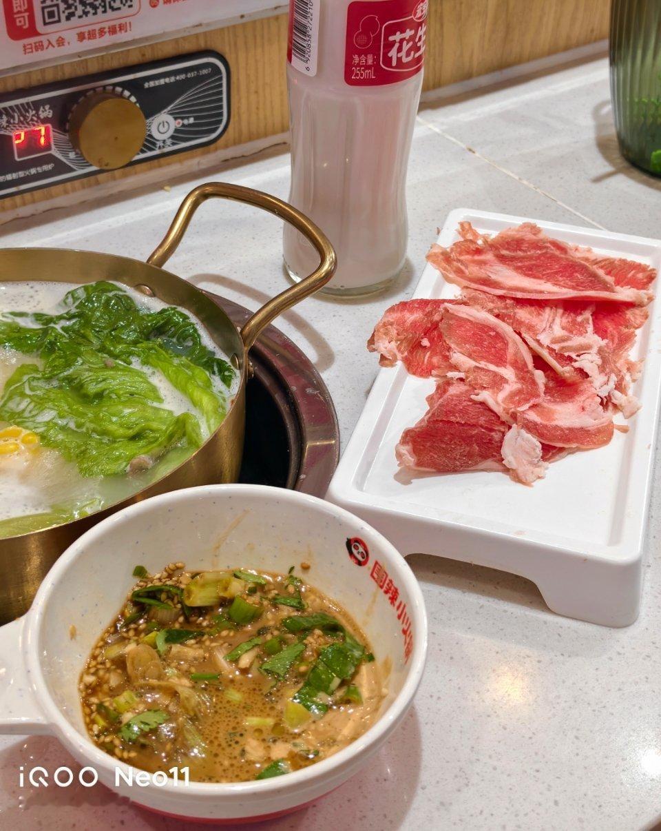 我和家人吃饭,真的是两极分化呀,我要的是猪肚鸡汤锅,他要的是辣红袍牛油锅我要了一个热的花生露,新鲜的羊肉,还有菜花,玉米萝卜,他里面放的全是各种我吃不了的比如说豆皮,土豆,这种我吃了消化不好的啥的北方的冬天吃这种小火锅真的挺好的,各吃各互相也不打扰iqooiqoo neo11