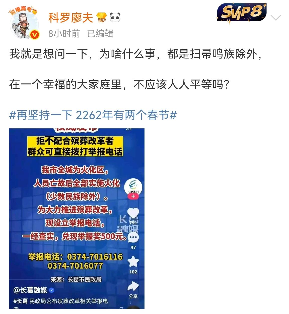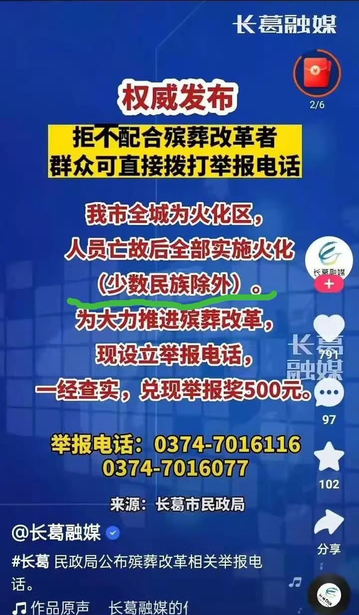 不知道为什么,既然全市都为火化区,为什么通告里只针对某一个民族? 查了一下历史,几千年来这个民族也没有这个的传统。 政策,大家都是无条件支持的。 但还是忍不住想问56个民族,只对一个民族执行的政策,是强制的吗?是必须的吗? 作为一个少数民族,为了团结与公平,诚恳呼吁相关政策能够以地区划分而不是以民族划分。 国家是一个大家庭,每一个人都是家庭的一份子,珍惜这个家庭的每一个人。