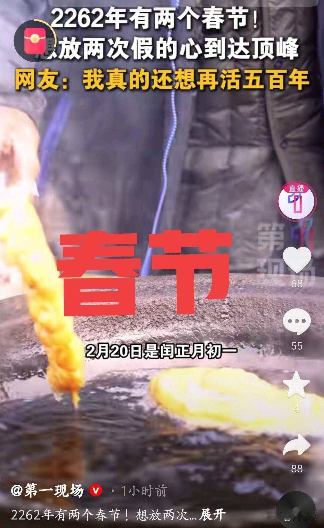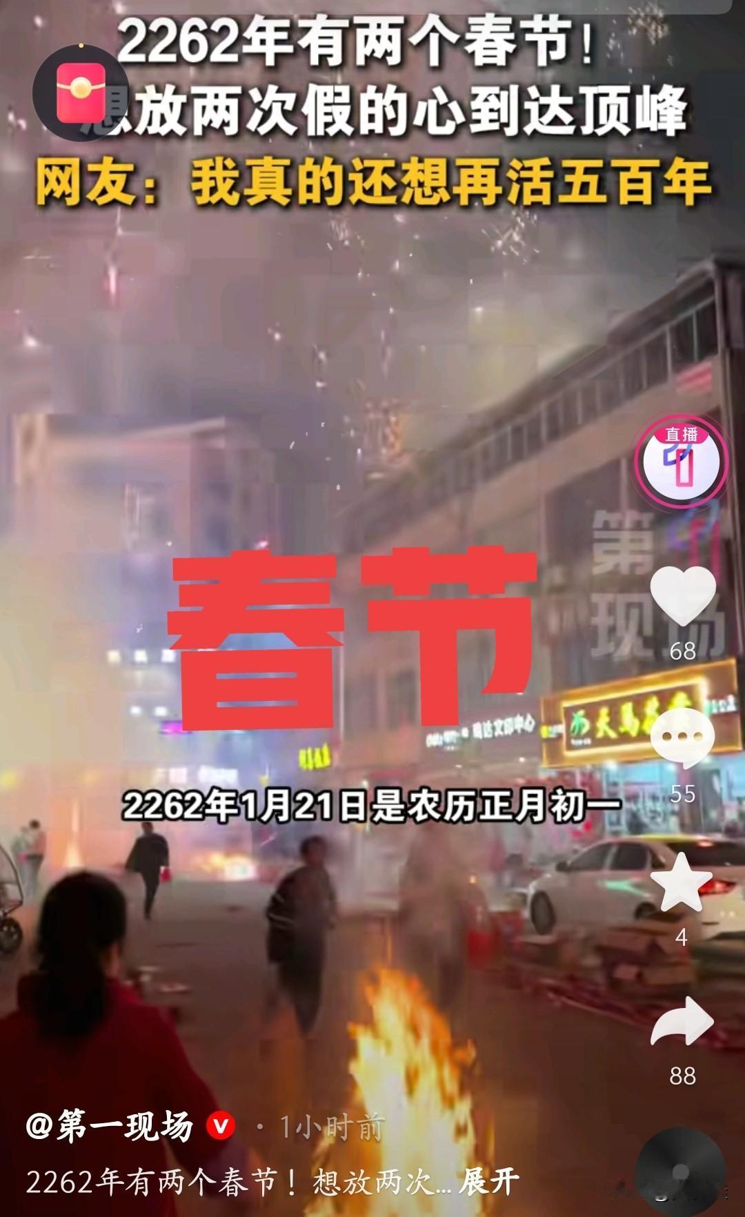 我看是太闲了,无聊到研究2262年有两个春节,目前地球上活着的人里,没一个能活到那时候啊,我们的下下下下下下下一辈都不一定还在世。算算时间,2262年离现在还有两百多年。 与其盯着几百年后的节日空想,不如好好过好当下的每一个春节,和家人吃顿热乎饭,放放烟花聊聊天。毕竟那些遥不可及的热闹,哪比得上眼前实实在在的温暖来得重要。
