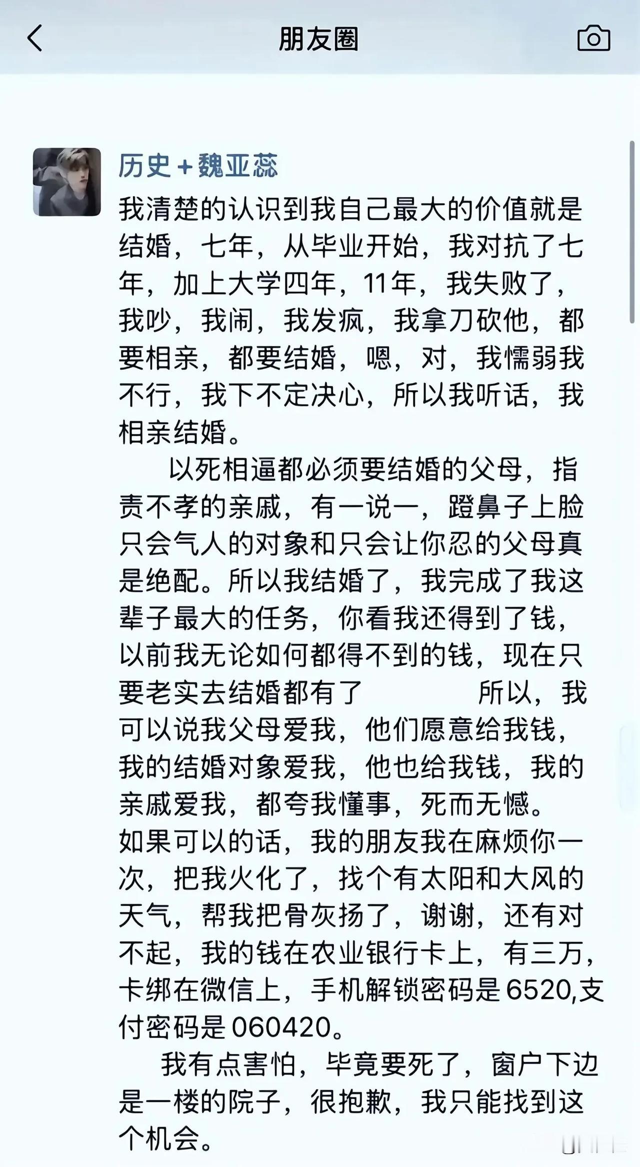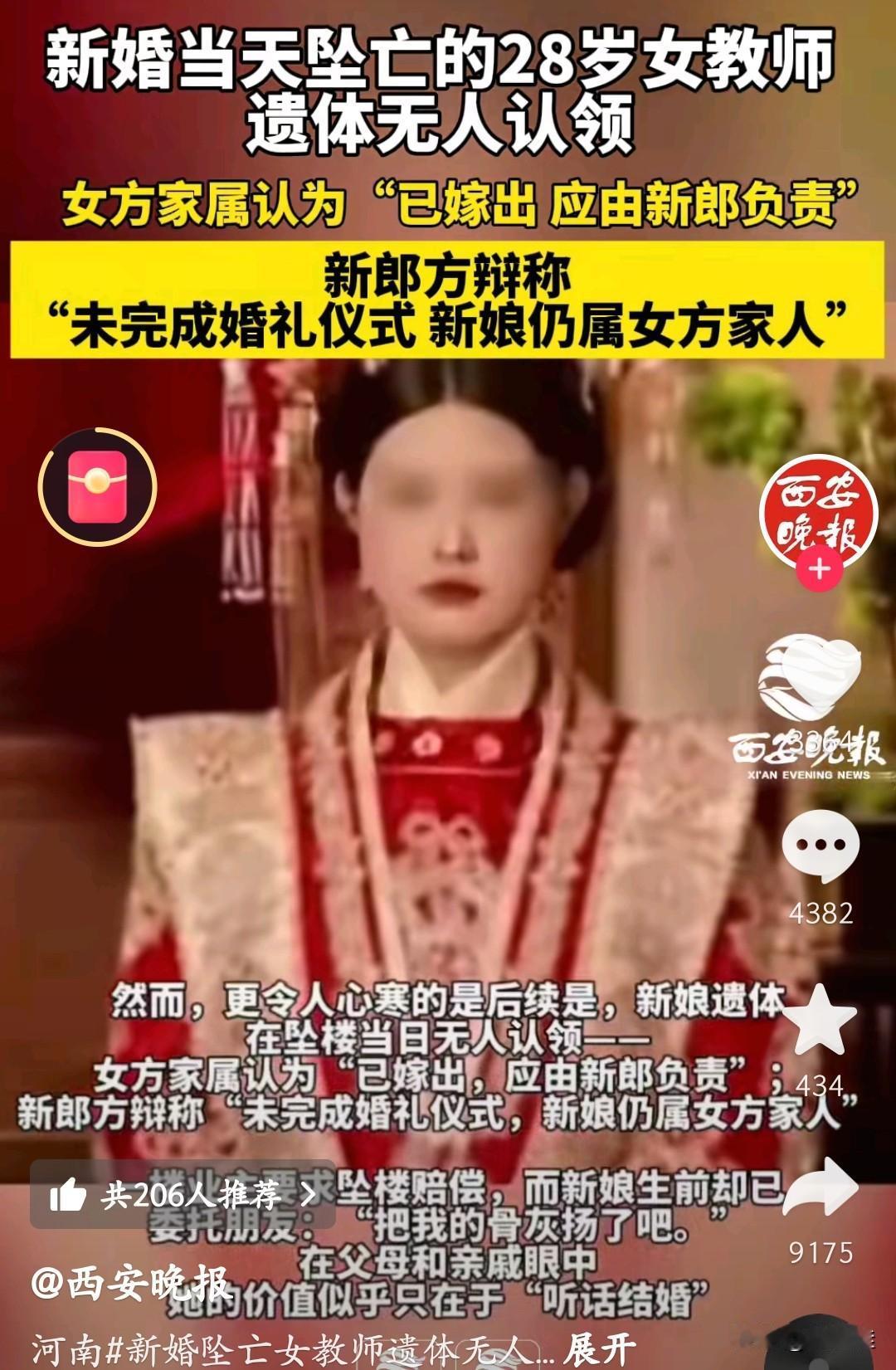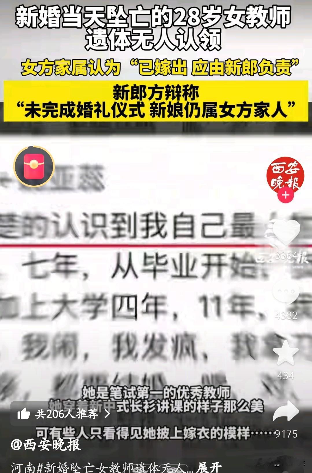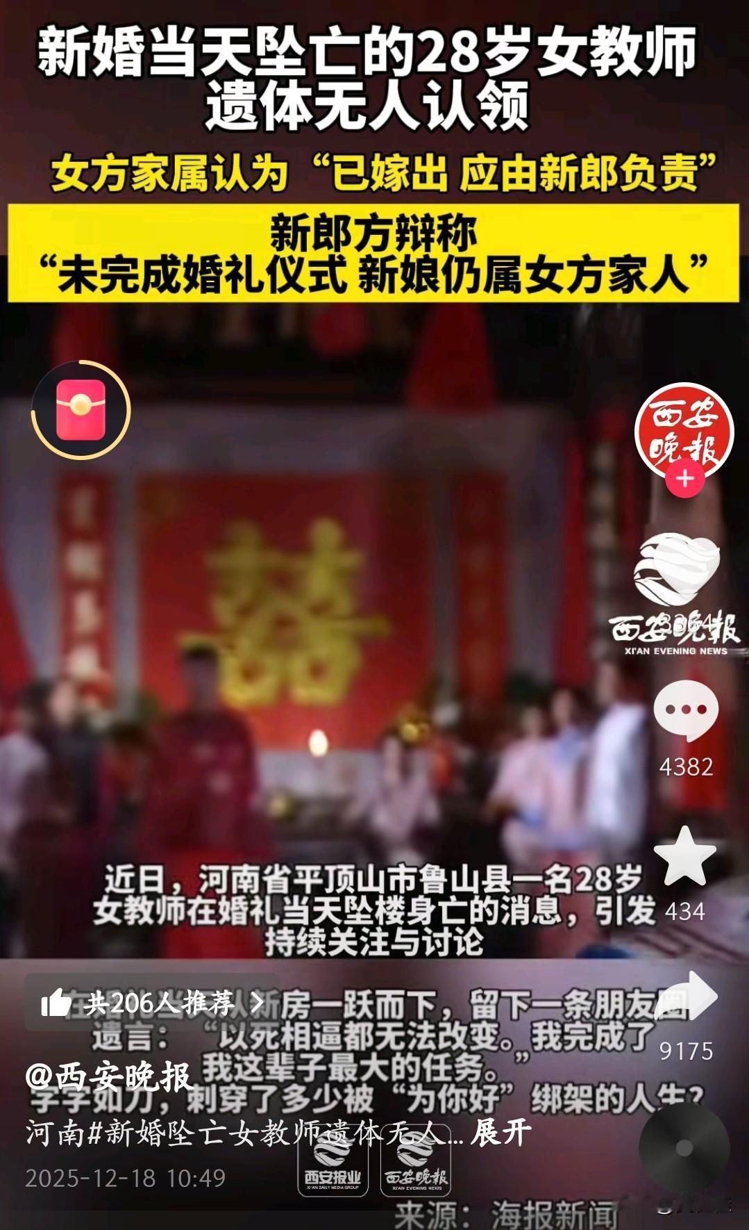 她到底生活在一个什么样的家庭,才能让一个28岁的优秀女教师,在新婚当天以坠亡的方式结束生命,死后遗体还被双方家属互相推诿? 这个笔试第一的女教师,明明有着光鲜的职业和亮眼的能力,却被家庭以“为你好”的名义绑架了十一年。从大学到毕业工作,她的反抗被当成胡闹,她的挣扎被视作发疯,家人眼里只看得见她披上嫁衣的模样,却看不见她对这场婚姻的抗拒,听不见她“以死相逼都无法改变”的绝望。 更让人寒心的是她离世后,女方家属一句“已嫁出,该由新郎负责”撇清关系,新郎方又以“没完成仪式”为由把责任推回女方。生时被逼迫着完成所谓“人生任务”,死后连遗体都成了双方不想承担的包袱。她生前嘱托朋友把骨灰扬了,或许早就料到,自己在这个所谓的“家”里,从来都不是被珍惜的家人,只是一个需要完成结婚使命的工具。